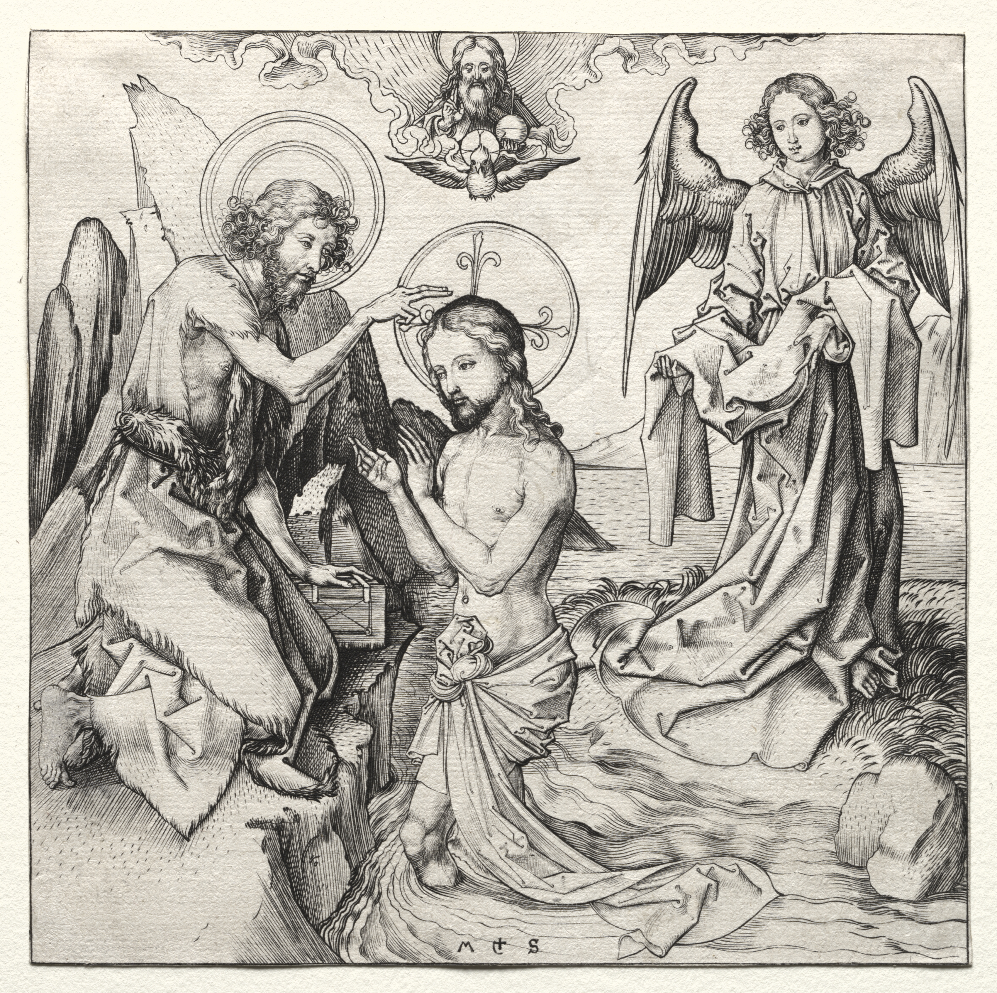 The image depicts a black and white drawing of a biblical scene. The central figure, a man with long hair and a halo, stands in water up to his thighs, wearing a cloth wrapped around his waist. His hands are raised, palms facing upwards. To his right, a man with a halo and long hair sits on a rocky outcropping, wearing a loincloth and a fur garment. He pours water over the central figure's head with his right hand. On the right side of the image, a woman with a halo and long hair stands on a rocky outcropping, wearing a long dress and holding a cloth. She has large wings behind her. Above the central figure, a haloed man with long hair and a beard sits on clouds, surrounded by wings. The background includes a body of water and a cloudy sky. The image is signed "M+S" at the bottom.