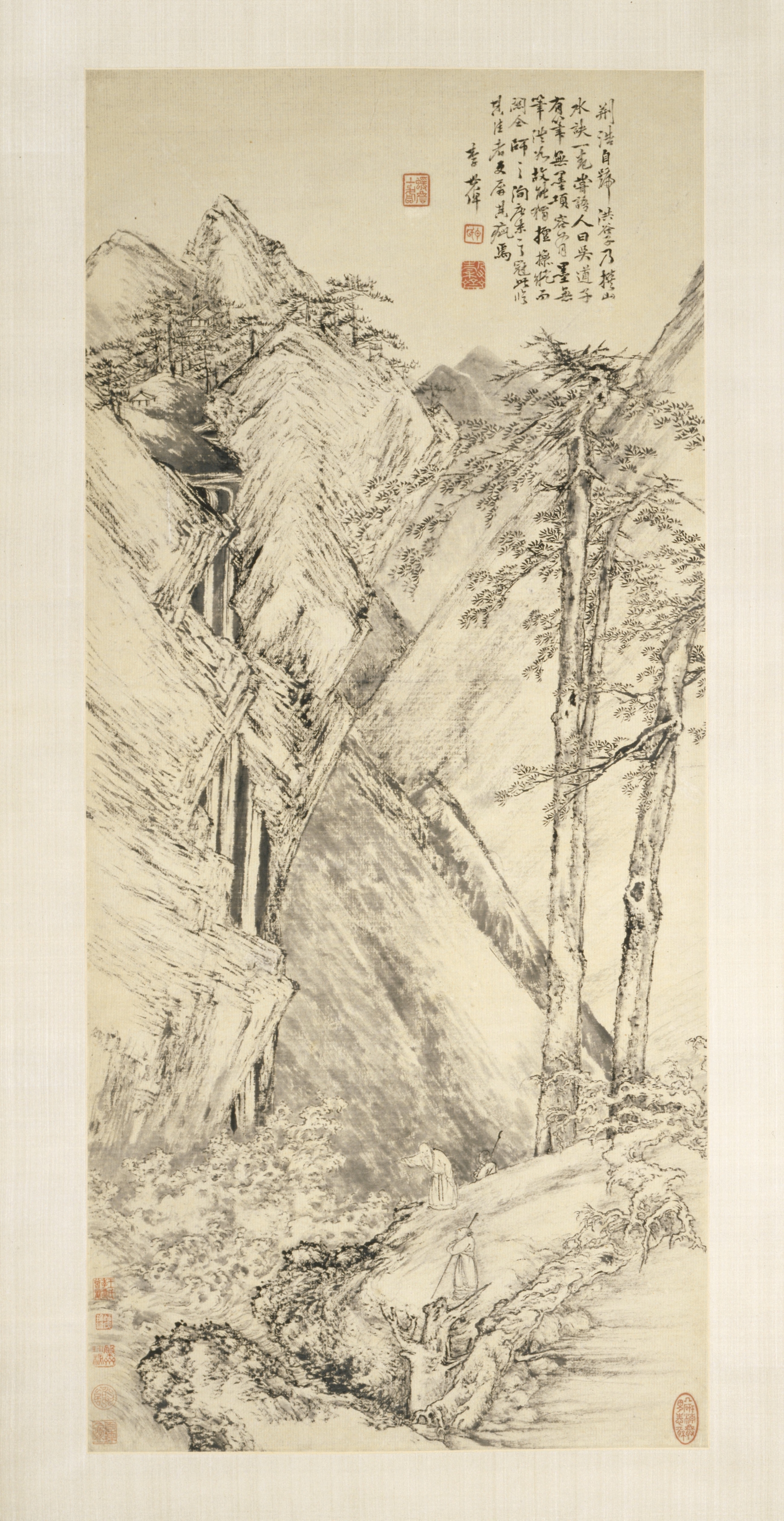 A black and white landscape painting on beige paper featuring mountains and trees. The mountains are depicted in the background and on the left side of the painting, with several trees on the right side. A small figure in a white robe appears to be standing on a path on the left. The painting includes Chinese calligraphy in the top-right corner and several red seals. The artwork, titled "Landscape after Jing Hao and Guan Tong," is by Li Shizhuo.