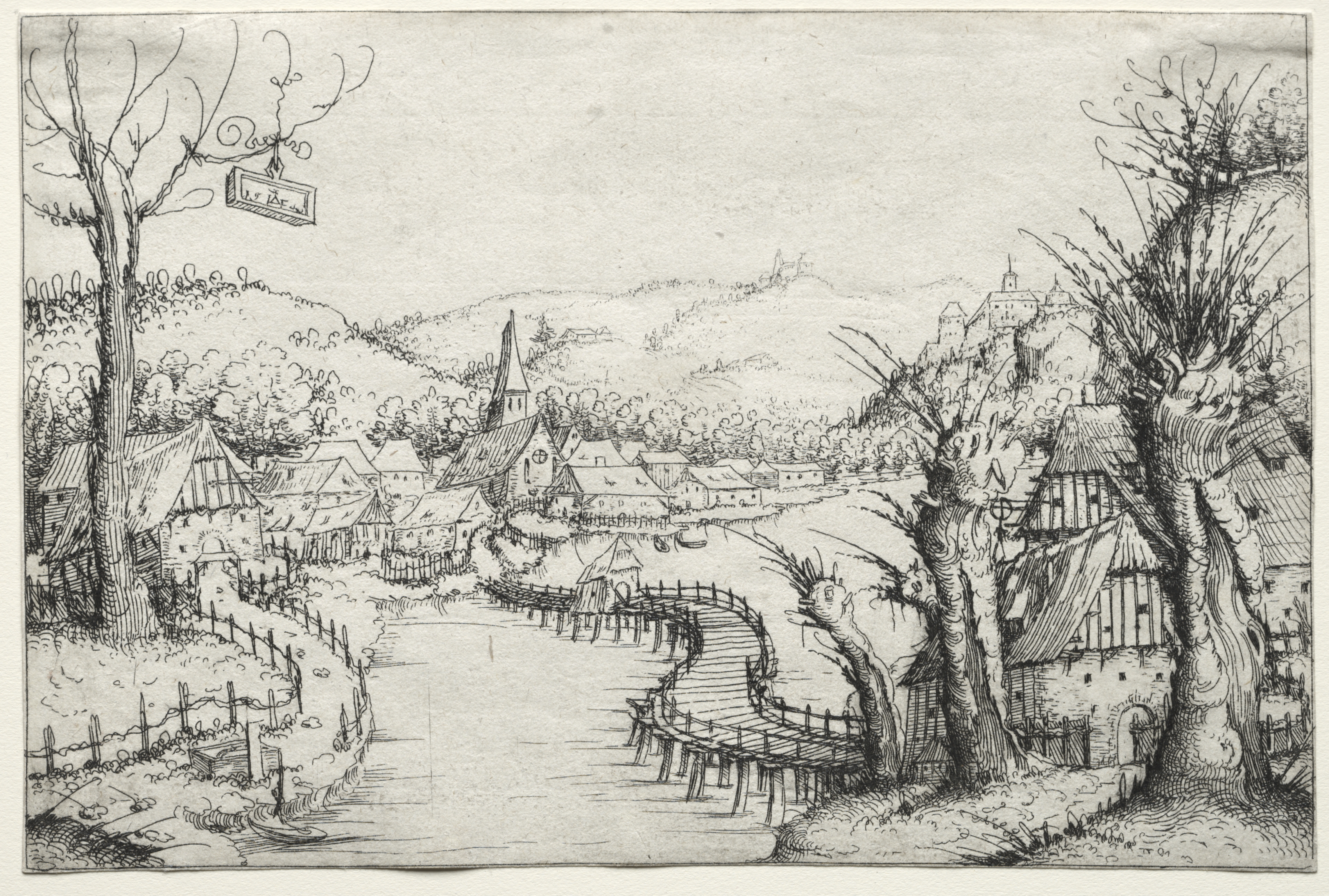 River Landscape with Three Bare Willow Trees at Right and a Long Winding Wooden Bridge at Center Leading to a Village