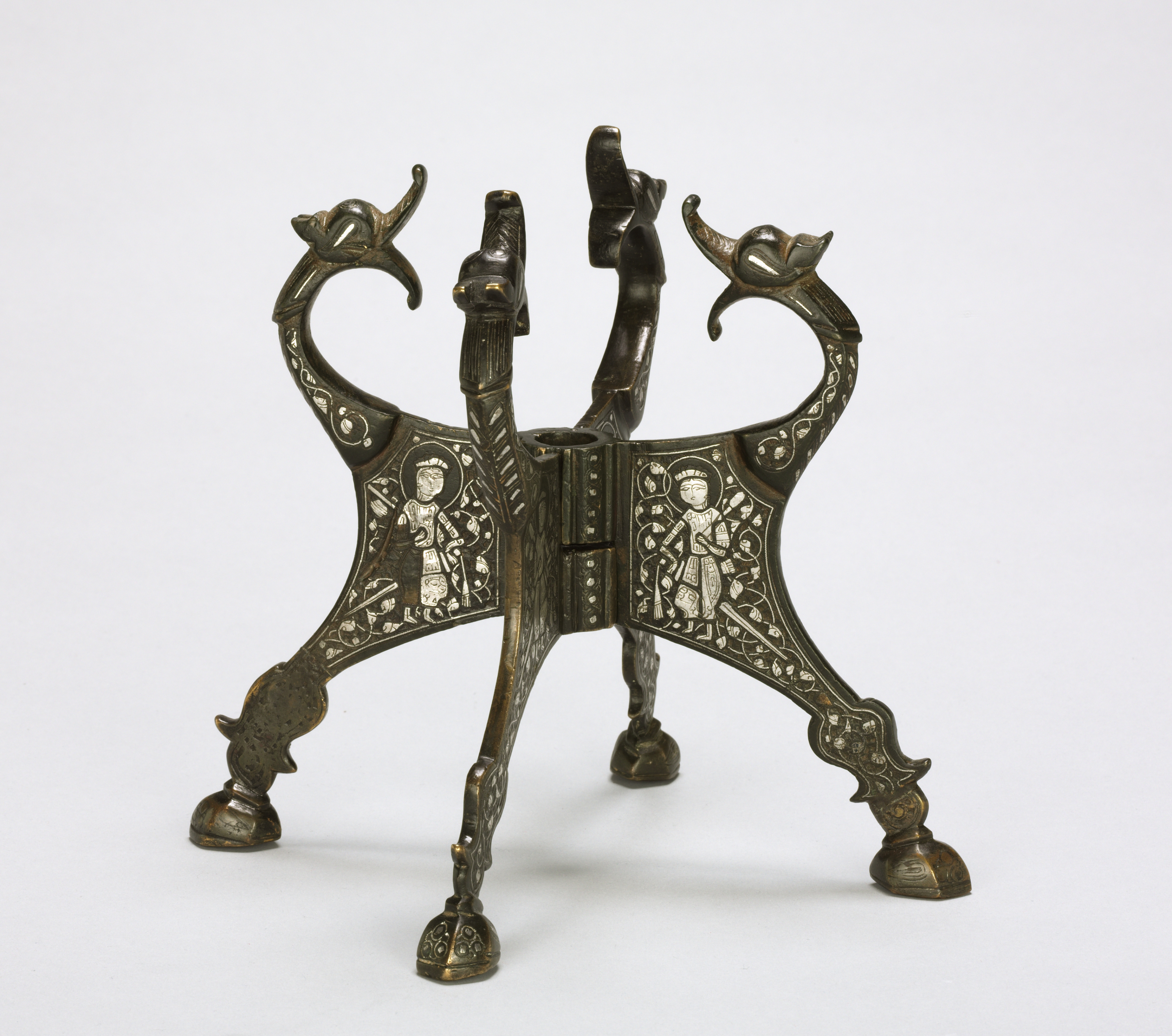 Metal object with bronze color, Dragon-headed Stand by artist. The object has a central hinge and is composed of four curved legs that meet at the top. The top features two dragon heads on either side, each with their mouth open. The object is decorated with etchings of people and floral patterns. The legs have a foot at the end, and the entire object has a dark patina. The background of the image is white. The object is shaped like a stand or a holder. It appears to be made of metal, possibly bronze or brass. The etchings on the object are intricate and detailed. The dragon heads are symmetrical and face outward. The people etched on the object are wearing robes. The floral patterns are composed of leaves and flowers. The object has a medieval or ancient appearance. It is displayed on a plain white background.