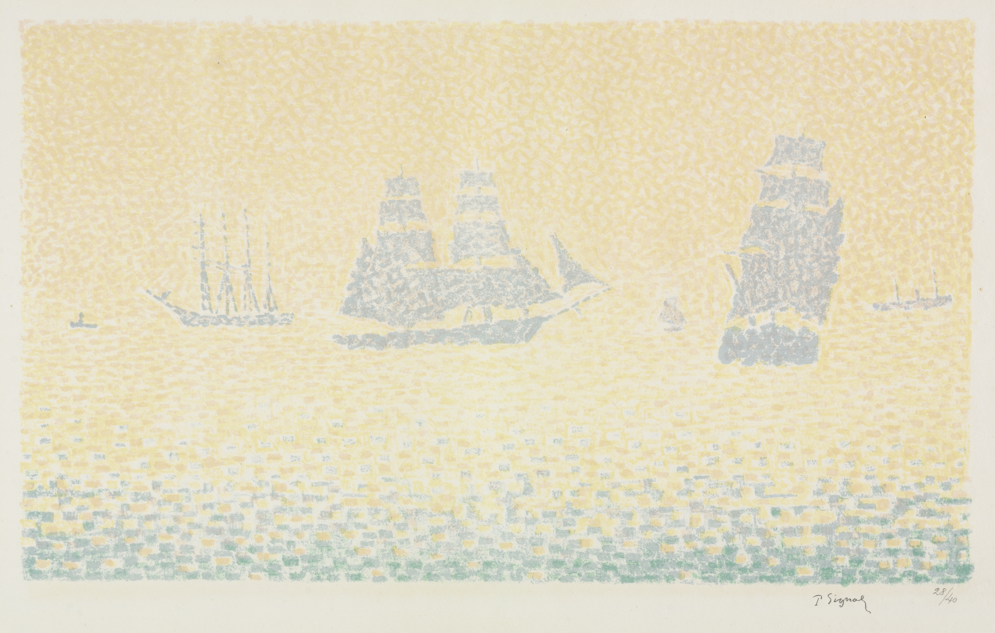 The image depicts a painting of boats on a body of water. The painting by Paul Signac features a yellow background with a pointillist style. Several boats are visible, with three large sailboats prominently displayed in the center and to the right. A smaller boat appears on the left. The water is depicted in shades of yellow and green, with the color transitioning from yellow at the top to green at the bottom. The artist's signature is in the bottom-right corner.