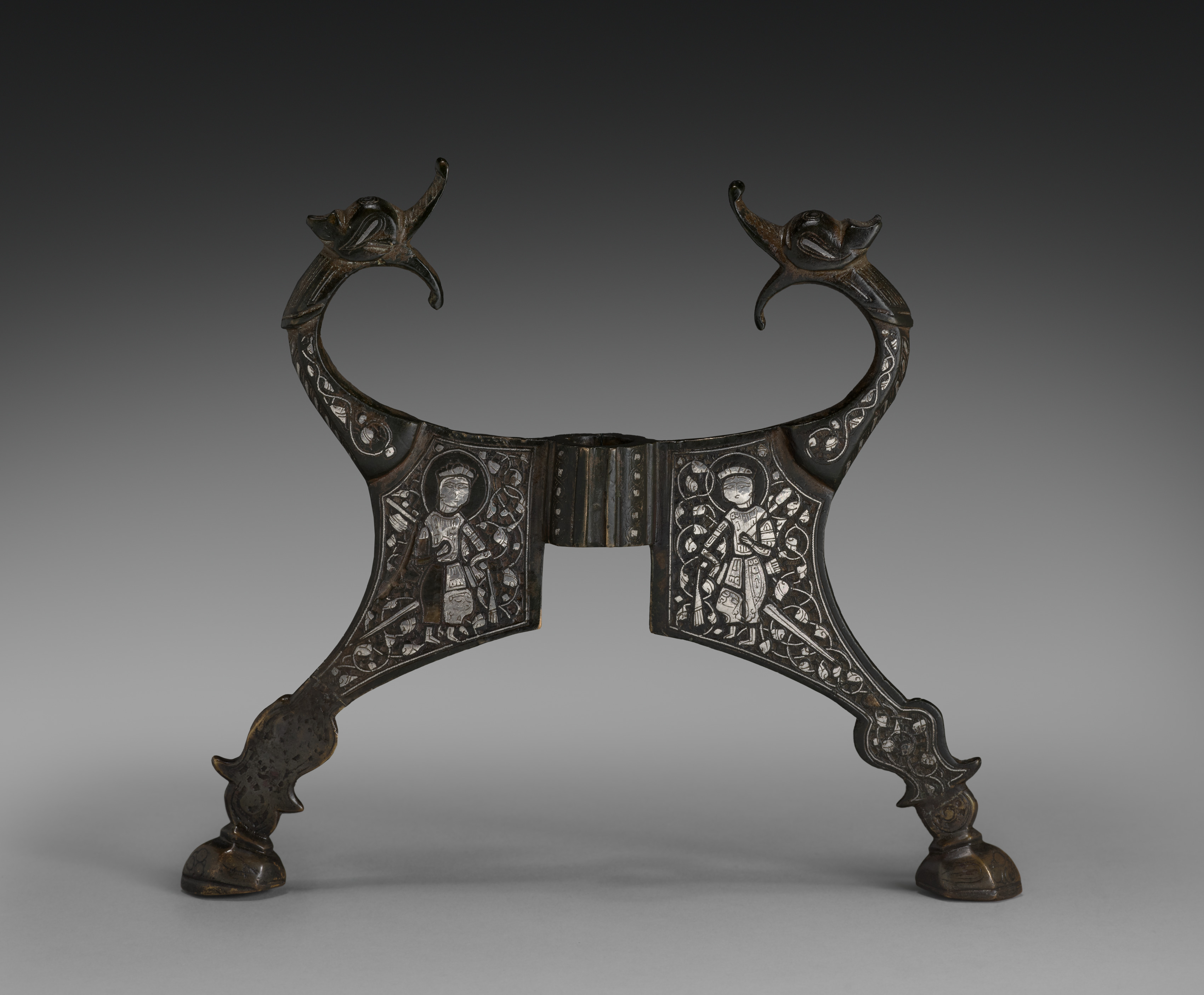 The Dragon-headed Stand by Unknown Artist. Dark bronze or metal object, curved top piece with two dragon heads on top ends, legs splay out to four feet, decorated with intricate carvings and etchings, two human-like figures on the inner sides of the legs.