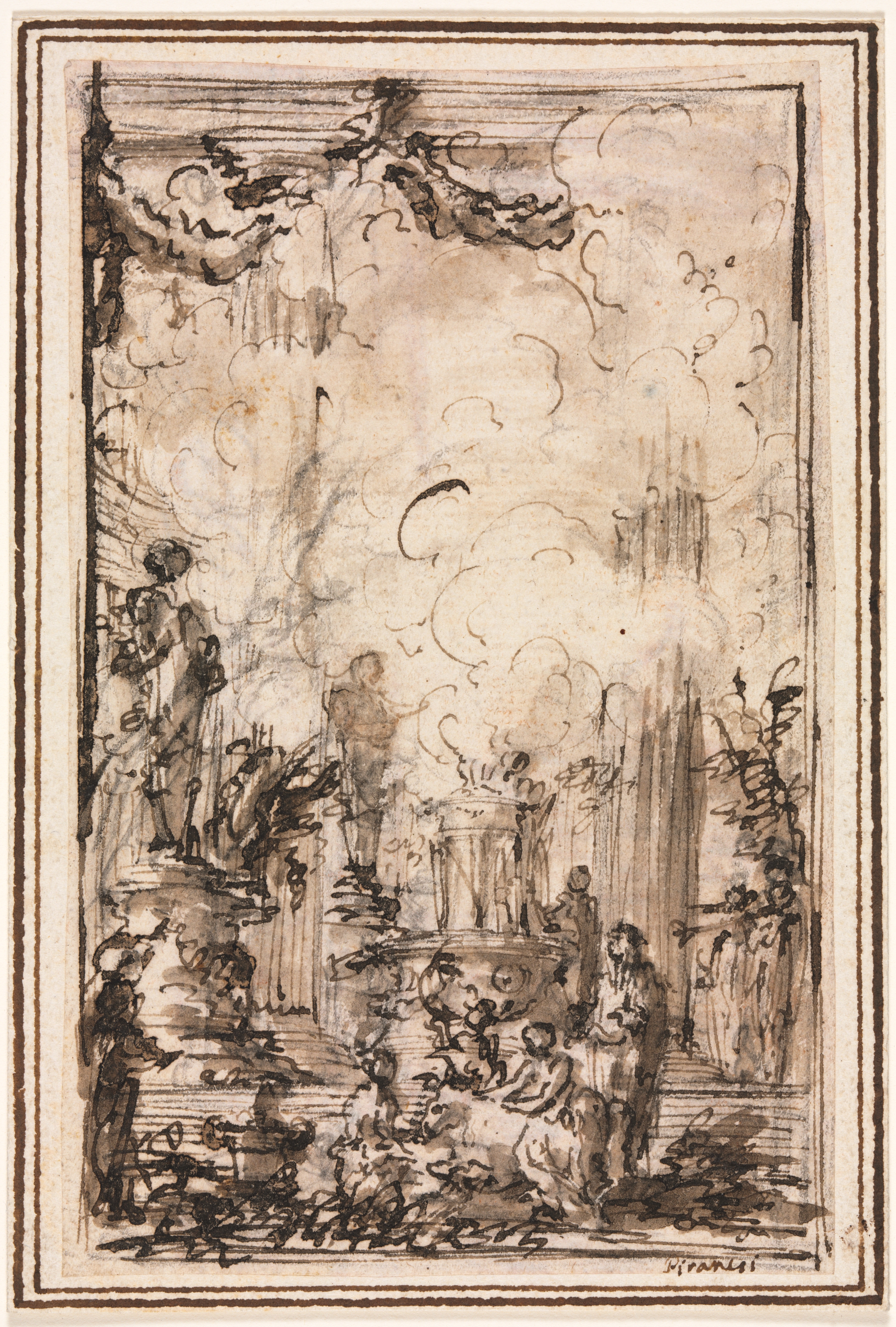 Brown and sepia drawing on beige paper with brown border. The drawing depicts a scene with many people, some wearing togas; a temple-like structure with columns in background. People on steps on left; figures on right; one on far right appears to be holding a staff. Several figures are gathered around a figure on ground in center; one figure appears to be on fire. There are plants on either side; cloudy sky with dark curved line; signature in bottom right corner.