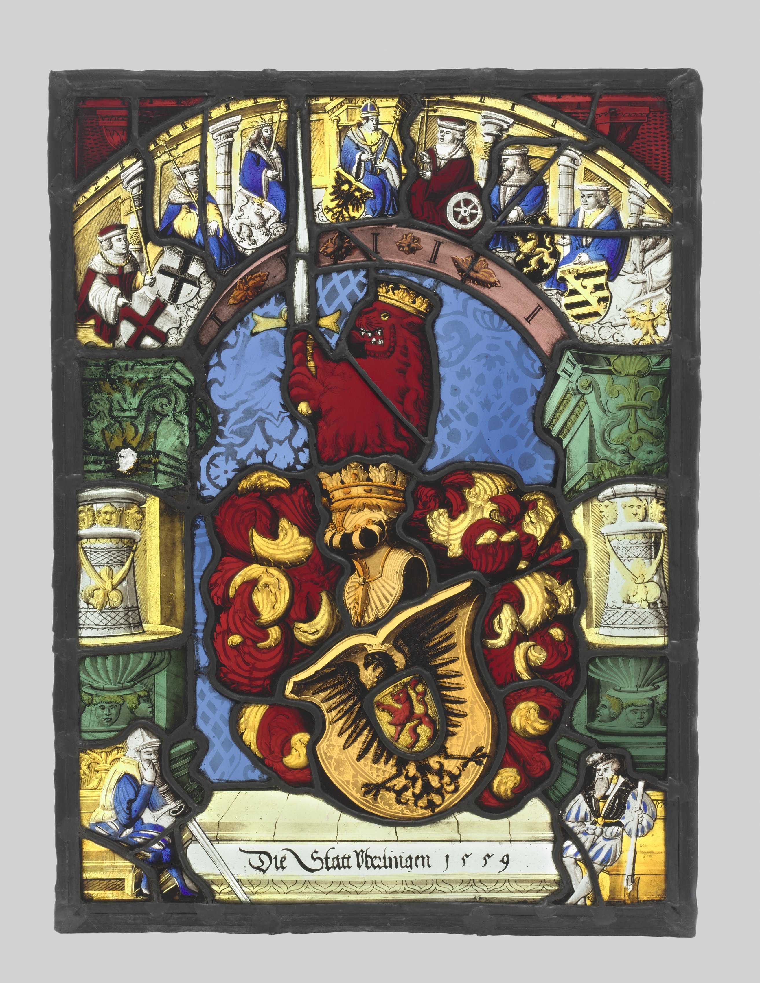 The stained-glass window titled "Arms of Ueberlingen" by an unknown artist features a predominantly blue background. A red creature with a crown on its head and a gold crown on its neck is centered. The creature has a large beak and appears to have wings. The creature is surrounded by red and gold decorations. A curved brown banner with illegible text and symbols is above the creature. The window's bottom features a white stone-like design with black text that reads "Die Statt Ueberlingen 1559". The left and right sides of the window have green pillars with gold accents and hourglass-like objects on shelves. Two men in period clothing are positioned at the bottom left and right. The top section contains various figures in robes and hats, with one figure holding a wheel and another holding a staff.