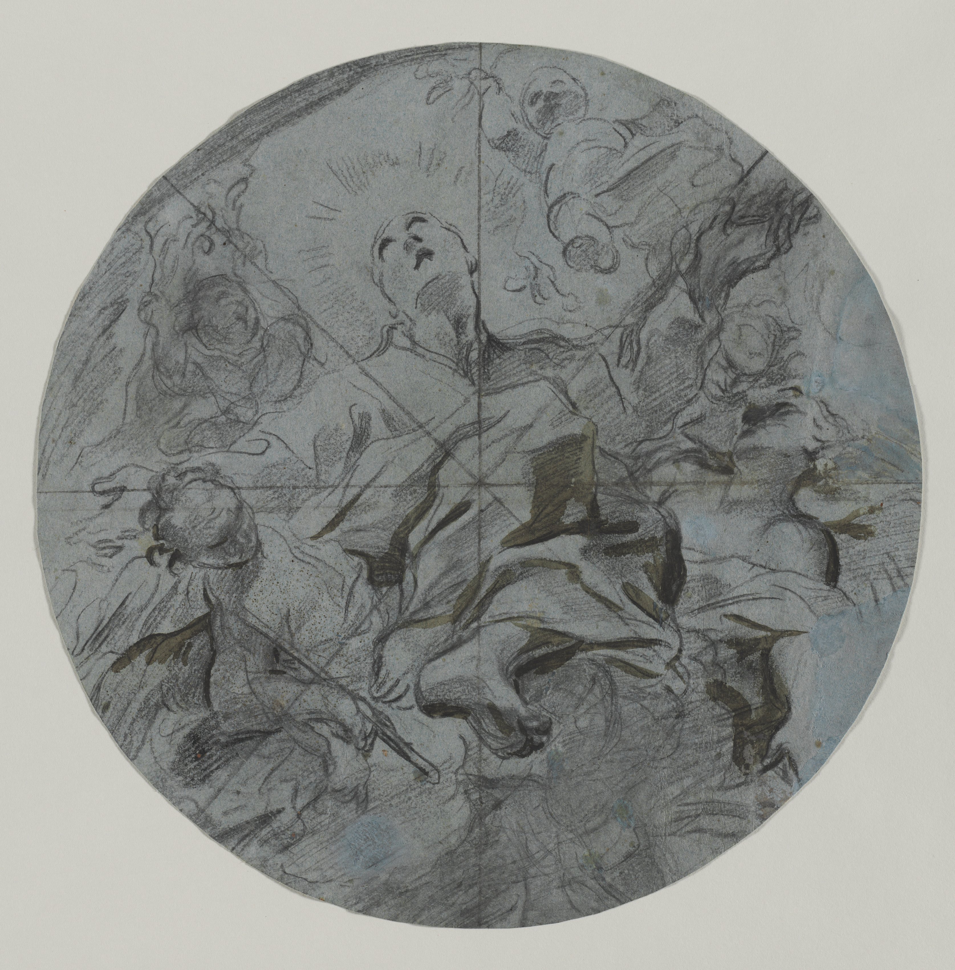 The drawing depicts a circular scene with several figures. A central figure in a long robe appears to be rising upwards or falling, with their head tilted back and arms outstretched. Two other figures are on either side, looking up. The figure on the left has short hair and a robe; the one on the right appears to be a woman with medium-length hair. There are additional figures in the background and above. The top figure seems to be holding something. The drawing is primarily in shades of gray and black, with some blue visible in the background, on the right side. Thin black lines intersect in the middle.