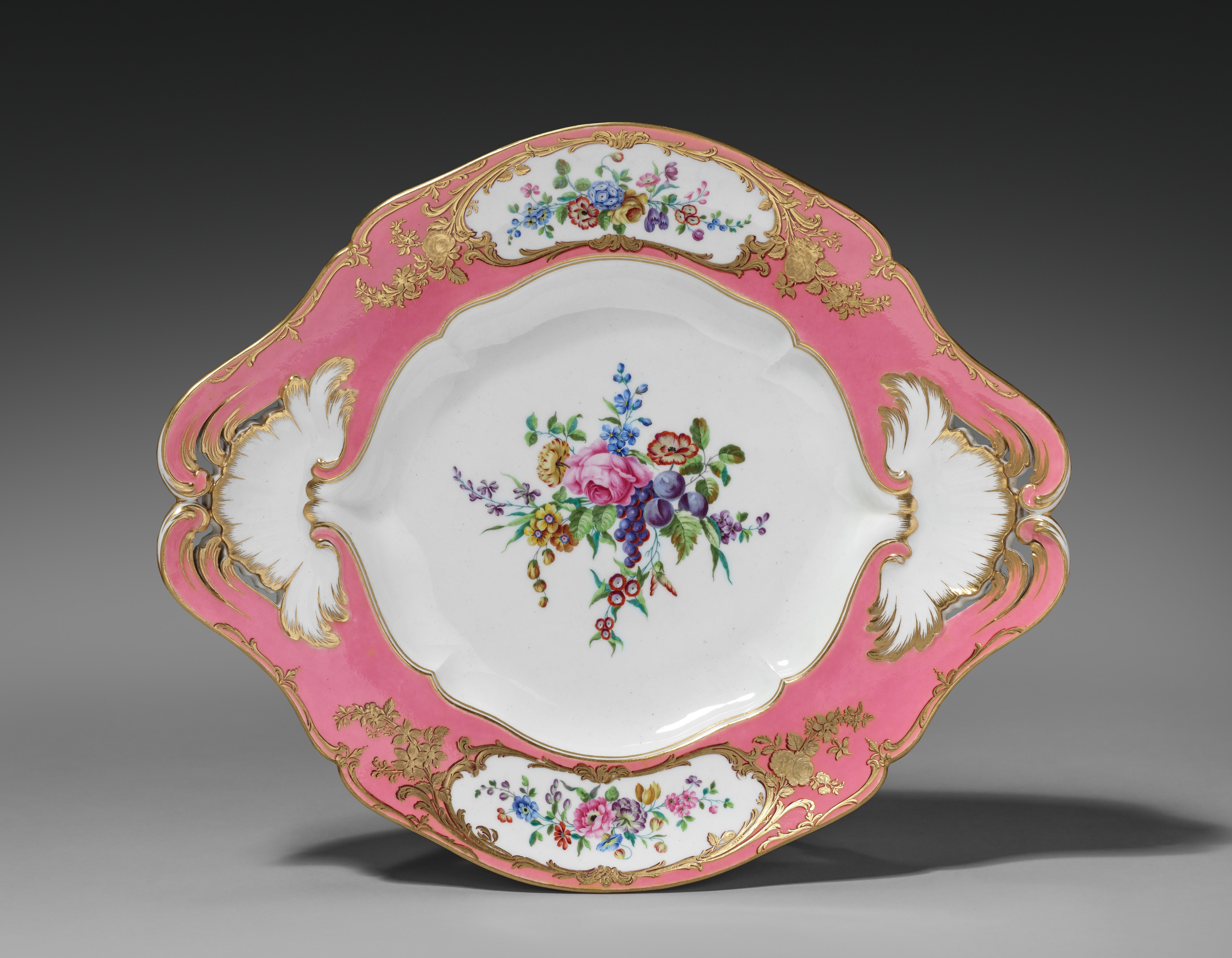 Pink and white porcelain stand for a covered tureen with gold trim, floral designs, and a scalloped edge. The stand has a white center with a floral arrangement in the middle. The edge of the stand is pink with gold accents and floral designs. There are three white sections with gold and floral designs on the pink sections. The background is a gray gradient.