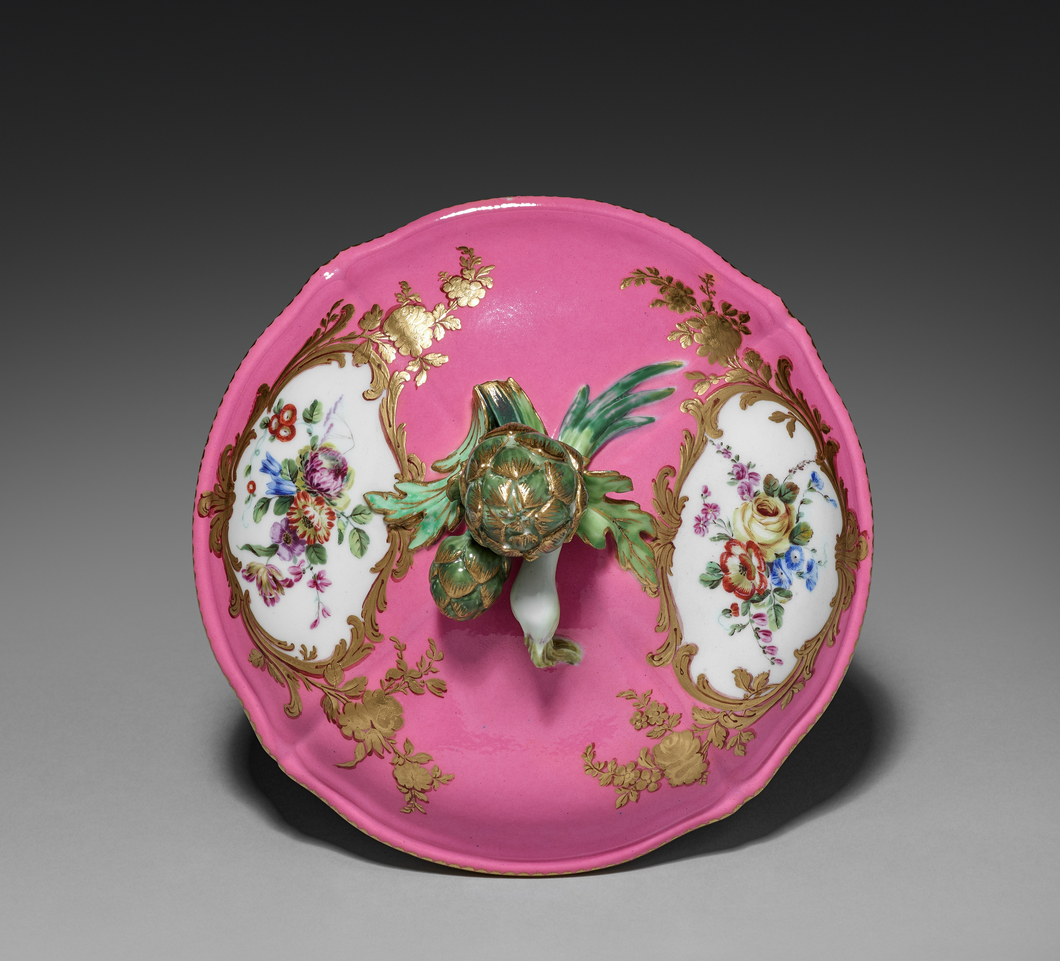 Pink tureen cover with a scalloped edge; two white oval medallions with floral decoration; stylized gold leaf patterns; green and gold finial; gray background.
