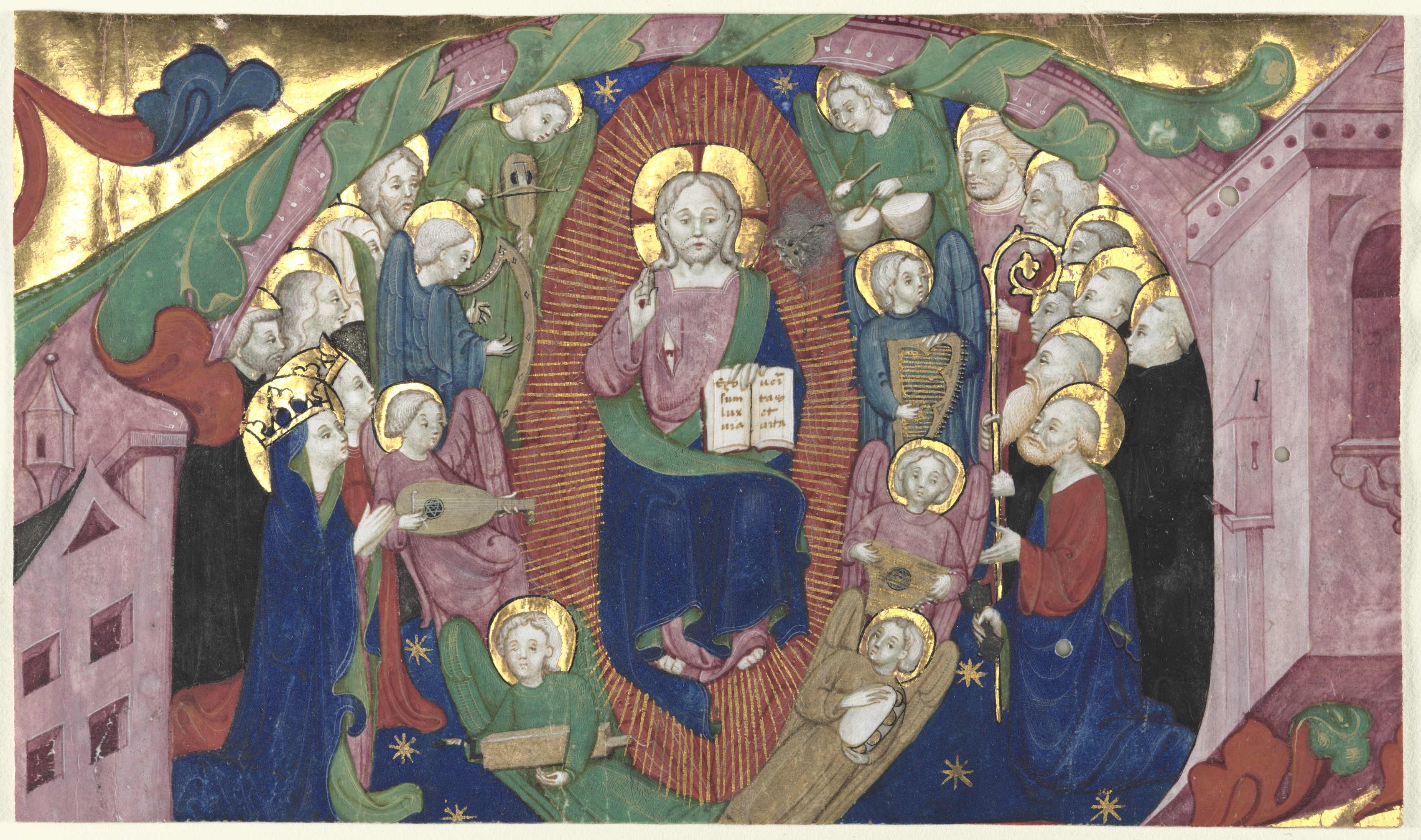 Medieval-style painting of Christ surrounded by angels and saints; Christ wears a pink shirt and blue pants with a gold halo, holding a book and pointing; he sits on a blue and gold background with a red sunburst; angels and saints are arranged in a circle around him, some playing instruments; a blue and red cloud and gold sky are above; buildings are on either side; the style is colorful and ornate.