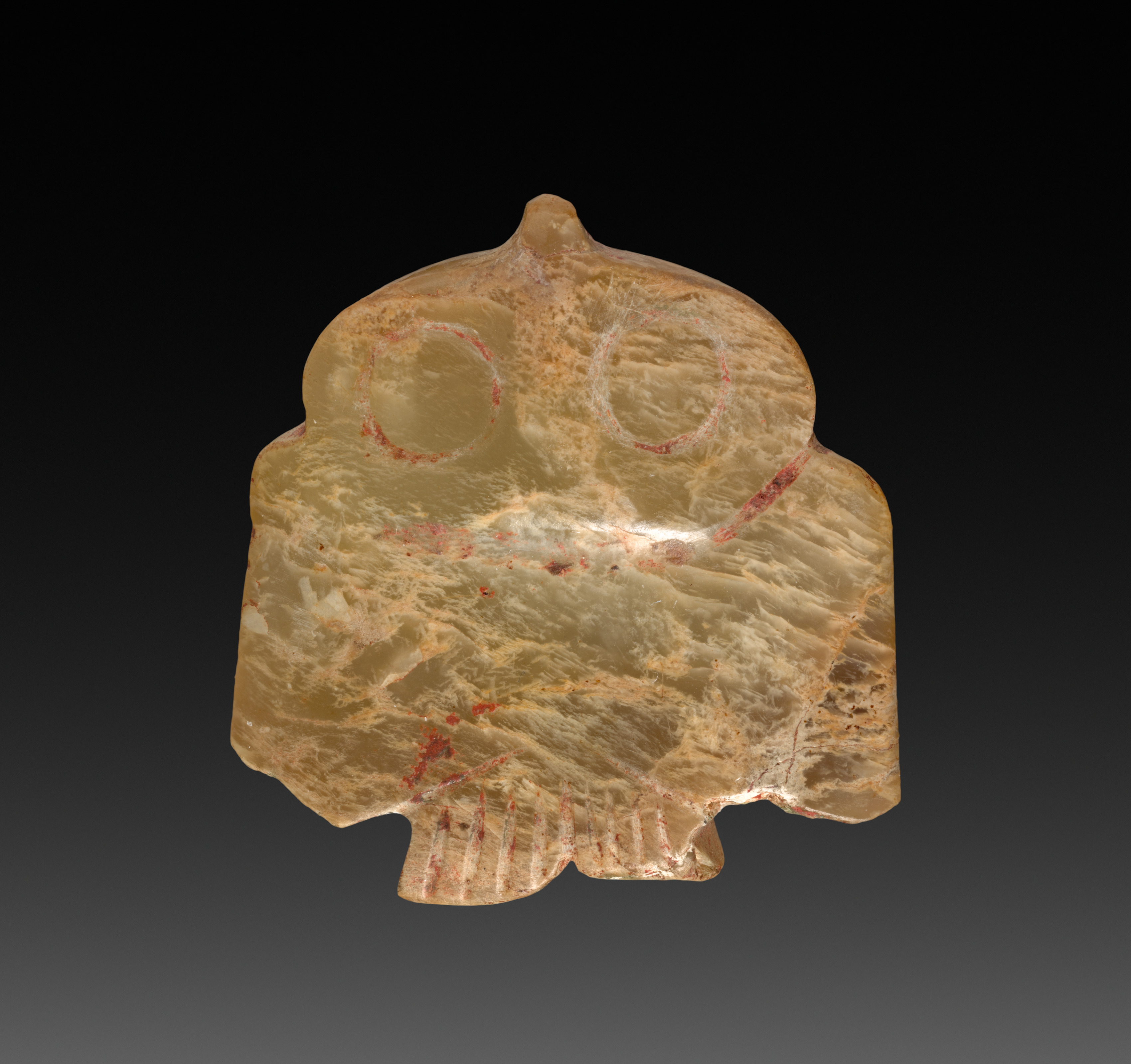 Carved tan stone bird with hints of orange and red; short stubby beak; two circles for eyes; red painted smile; wings on sides; tail at bottom; against black background; by Bird in Flight; titled Bird in Flight.