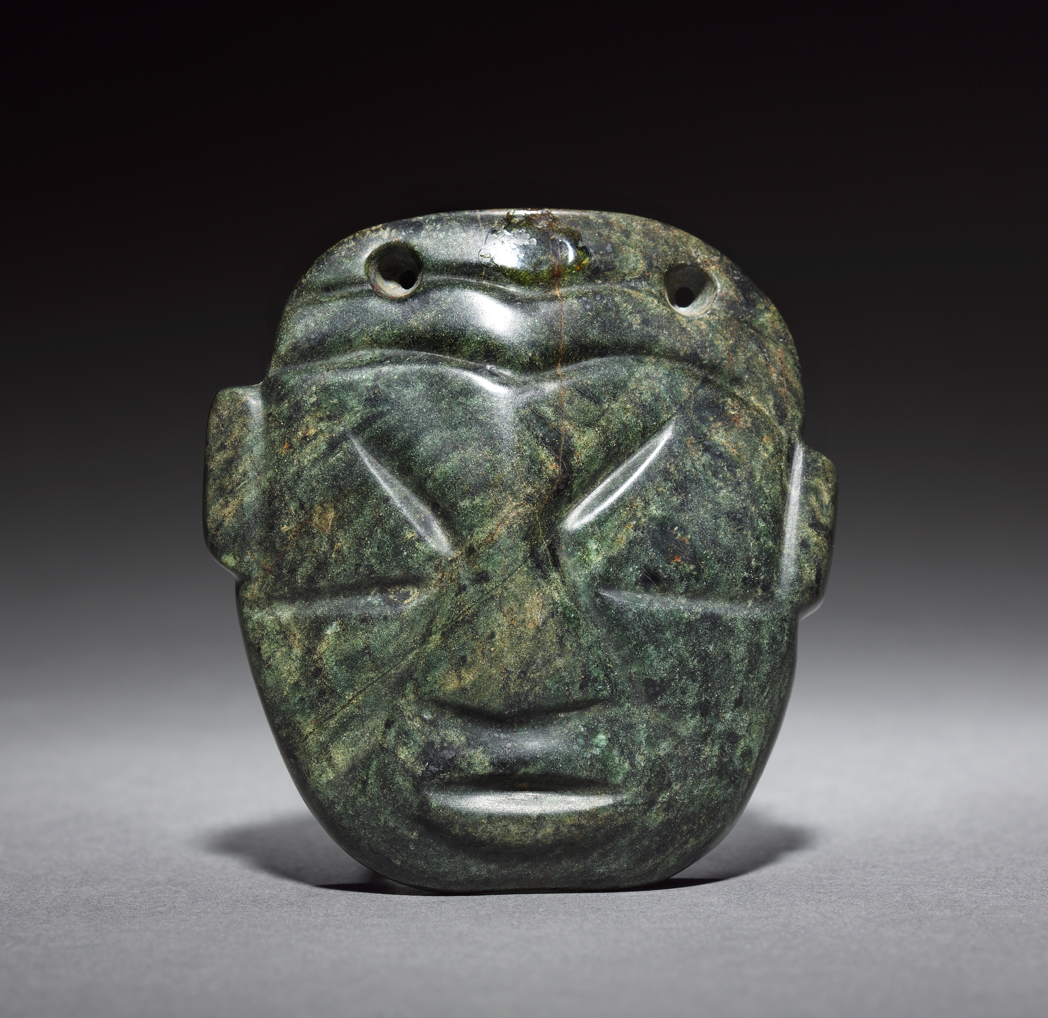 Green stone carving of a face with a wide nose and mouth, almond-shaped eyes, and two holes at the top. The face has a rounded top and small protrusions on either side, resembling ears. The stone is dark green with lighter green and brown speckles, and it has a smooth, shiny surface. The face is carved with a neutral expression, and the background is a gradient from black to gray. The carving is titled "Pendant" and attributed to an unknown artist.