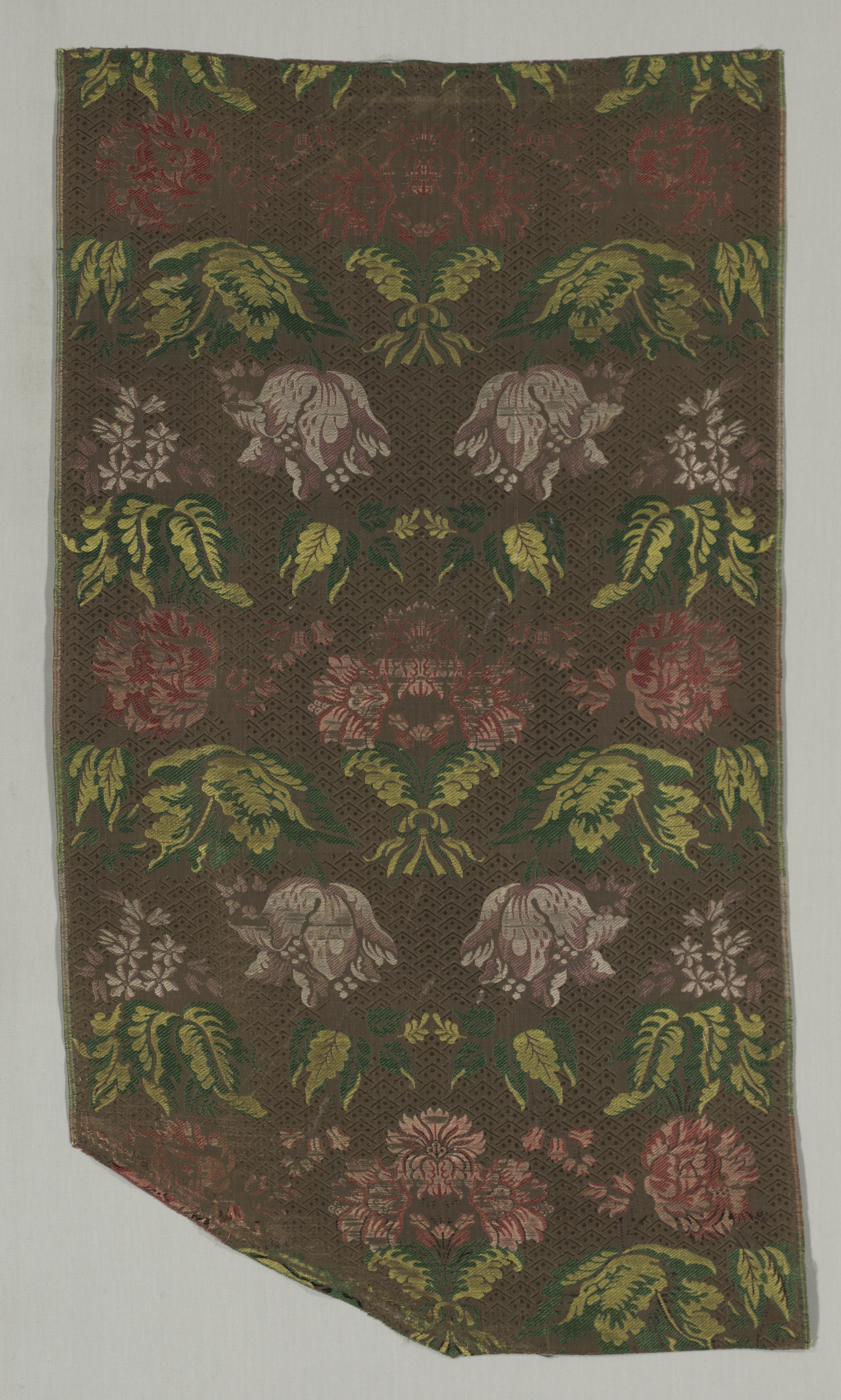 Length of silk textile by unknown artist. The textile is rectangular with one bottom corner cut off. It has a brown background with a repeating floral pattern. The flowers are pink and red with green leaves. There are also some smaller white flowers. The pattern is arranged in rows, with each row featuring a different combination of flowers and leaves. The colors are muted, with shades of brown, pink, red, green, and white. The overall design is intricate and ornate. The fabric appears to be silk.