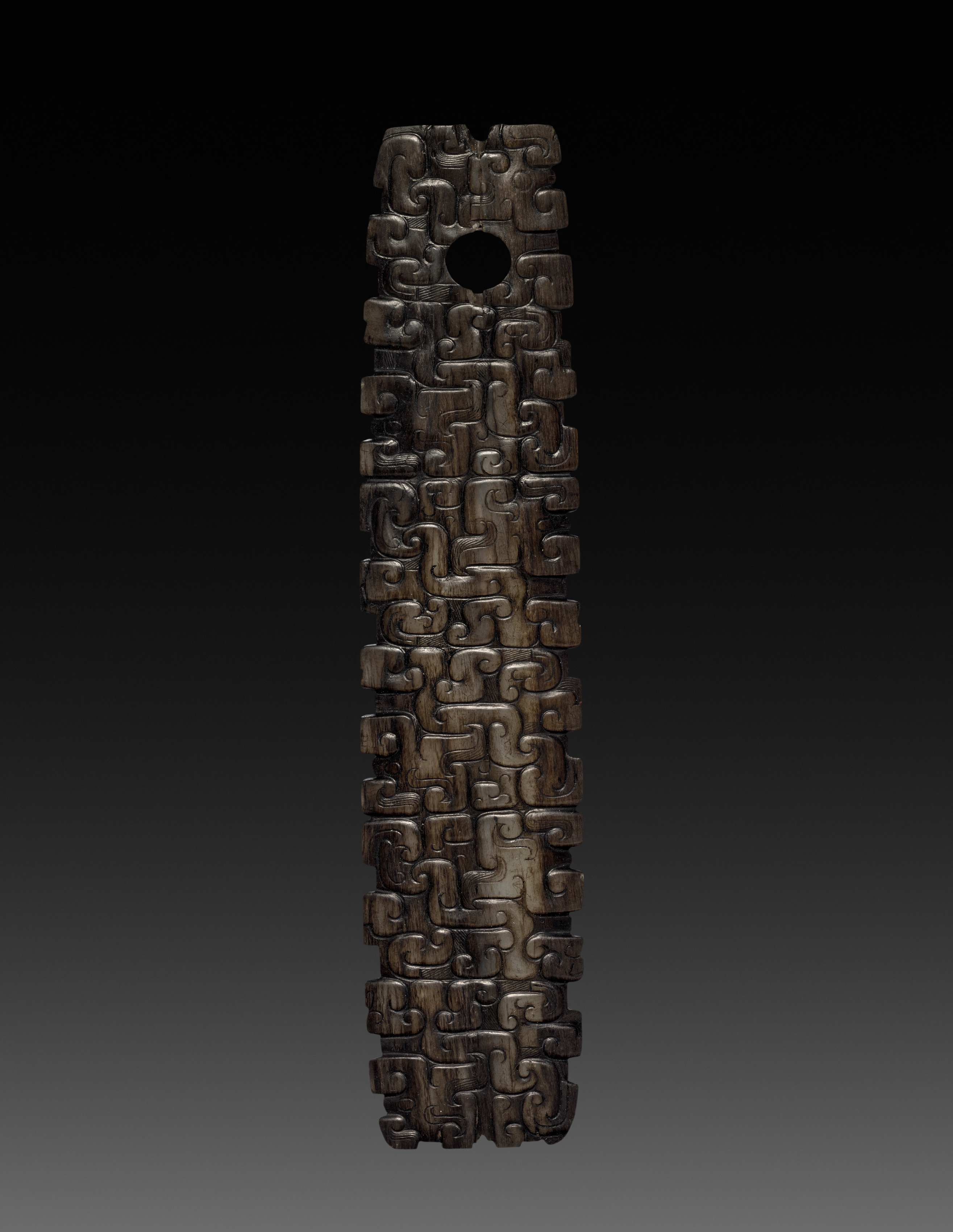 The Jade Scepter with Interlocking Pattern by Unknown Artist features a long and narrow jade scepter. The scepter is vertical with a rounded rectangular shape. A circular hole is positioned near the top. The surface displays a carved interlocking pattern covering the entire length. The jade appears dark green with some lighter green areas. The background transitions from black at the top to dark grey at the bottom.