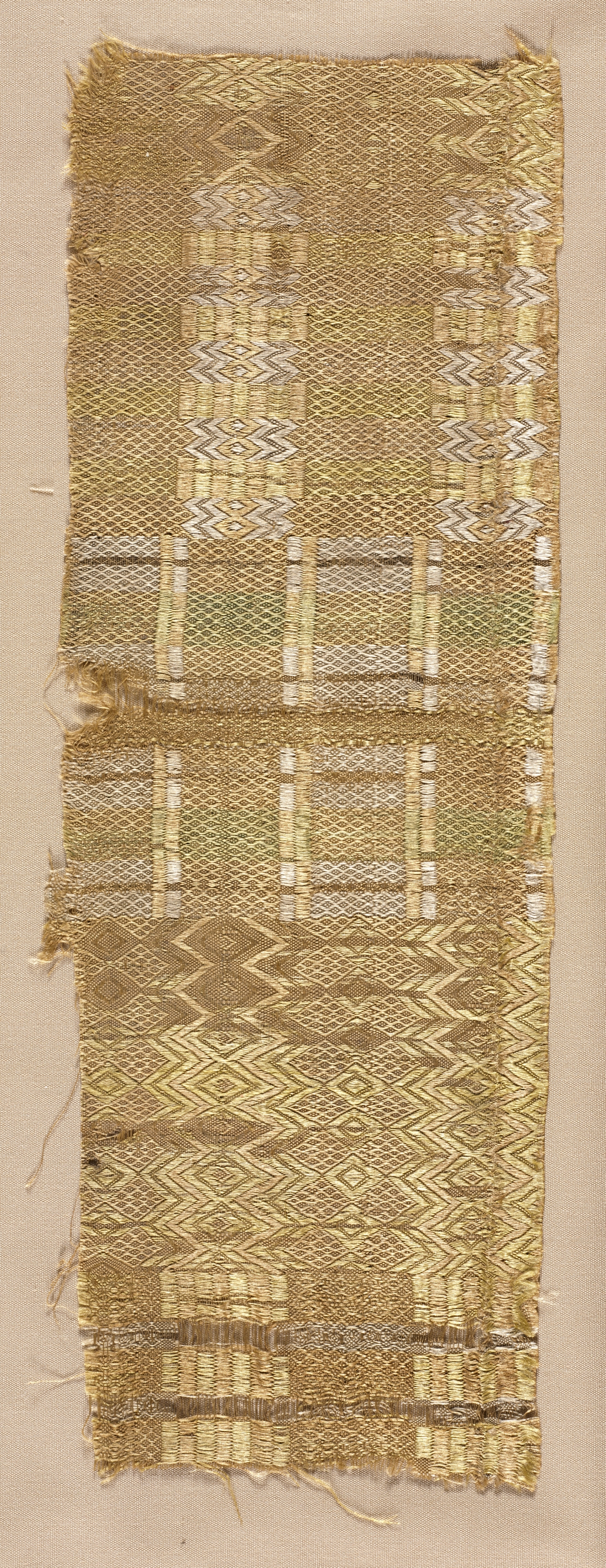 The image titled "Silk Fragment" by the artist shows a rectangular piece of fabric with a woven pattern. The fabric is primarily gold in color, with a mix of light and dark shades. It features a repeating pattern of geometric shapes, including diamonds, triangles, and rectangles, arranged in rows. The fabric appears to be made of silk and has a rough, frayed edge around the perimeter. The background of the image is a solid beige color, which provides a neutral contrast to the intricate details of the fabric. The fabric is positioned vertically, taking up most of the image.