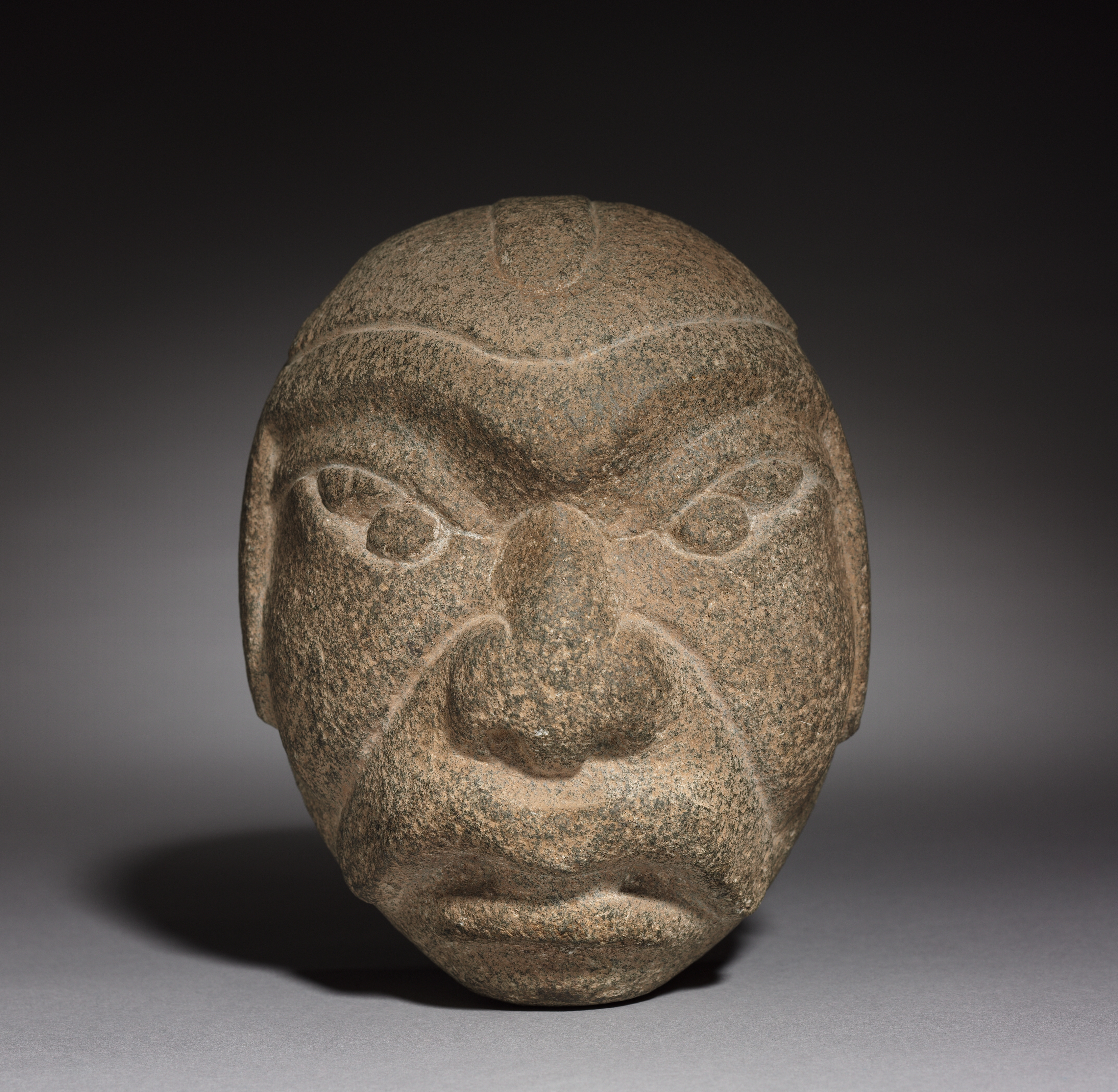 The sculpture, titled "Head," by an unknown artist, is a stone carving of a human head. The head is oval-shaped and appears to be carved from a speckled brown stone. The facial features are defined with a prominent nose, thick eyebrows, and a mouth with a subtle, downward curve. The eyes are carved with a sharp, angular shape, and the ears are partially visible on either side of the head. The background of the image is dark gray, with a lighter gray surface that the sculpture sits on, casting a shadow to the left.