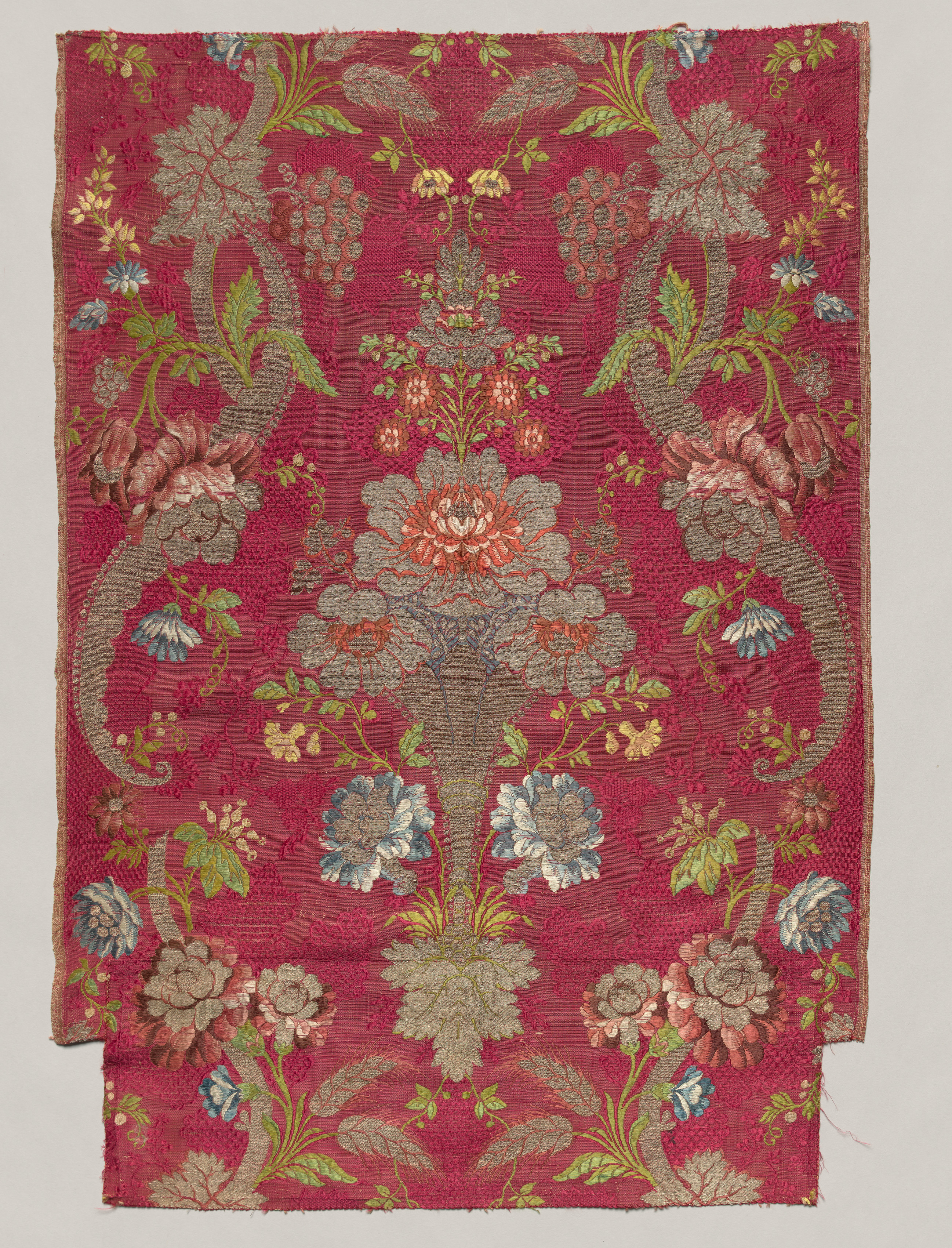 Silk Fragment by an unknown artist is a red silk fabric with a floral pattern. The fabric features a dense arrangement of colorful flowers, leaves, and stems in shades of pink, blue, green, yellow, and gray. A large flower is centered on the fabric, with curved branches extending upwards and outwards on either side. Smaller flowers and foliage are scattered throughout the fabric. The edges of the fabric are rough and frayed. The background of the fabric is a solid red color. The overall design suggests a 18th or 19th-century European textile.