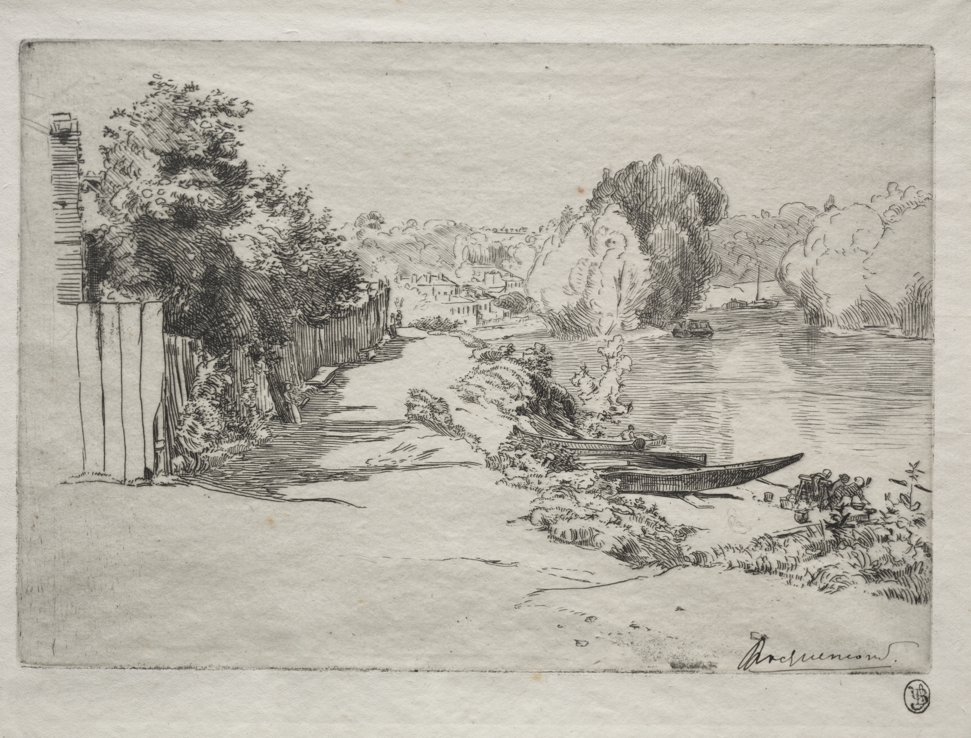 The Seine at Bas-Meudon by Félix Bracquemond: A black and white drawing of a riverbank scene. A paved path runs along the left side, bordered by a low wall topped with a chimney and dense foliage. A small boat sits on the riverbank at the path's edge, with another boat on the water. The river stretches to the right, lined with trees. Buildings are visible in the background. The sky appears clear. The artist's signature is in the bottom right corner.