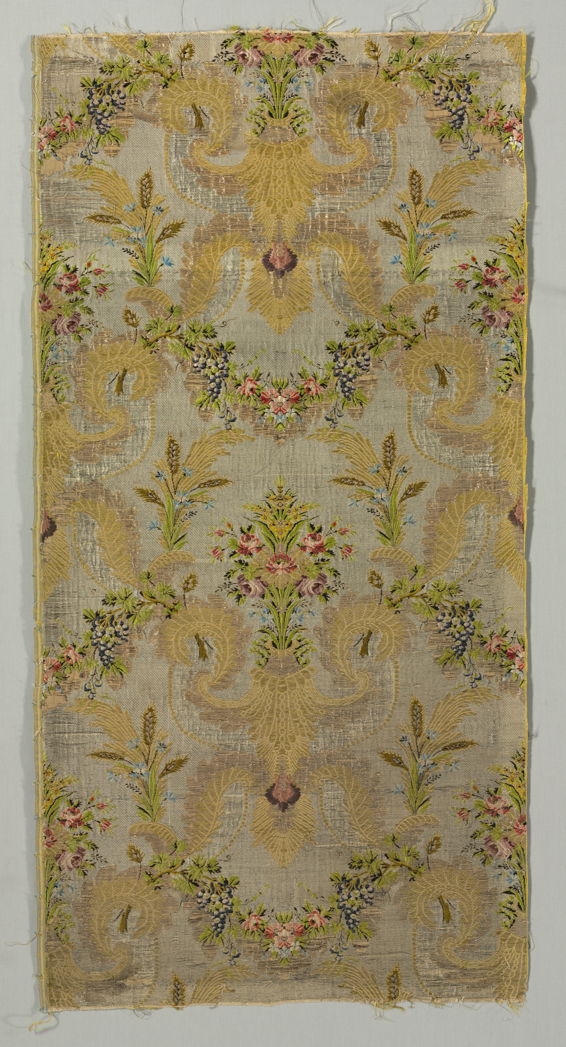 The image shows a rectangular piece of silk cloth by artist not identified. The cloth is beige with a repeating pattern of gold-colored designs. The design features a symmetrical arrangement of floral motifs and leaves in shades of pink, blue, green, and brown. The floral motifs are arranged in a repeating pattern of four, with each motif featuring a cluster of flowers and leaves at the center. The background of the cloth is a light beige color, and the edges appear to be frayed. The overall effect is one of intricate, ornate decoration.