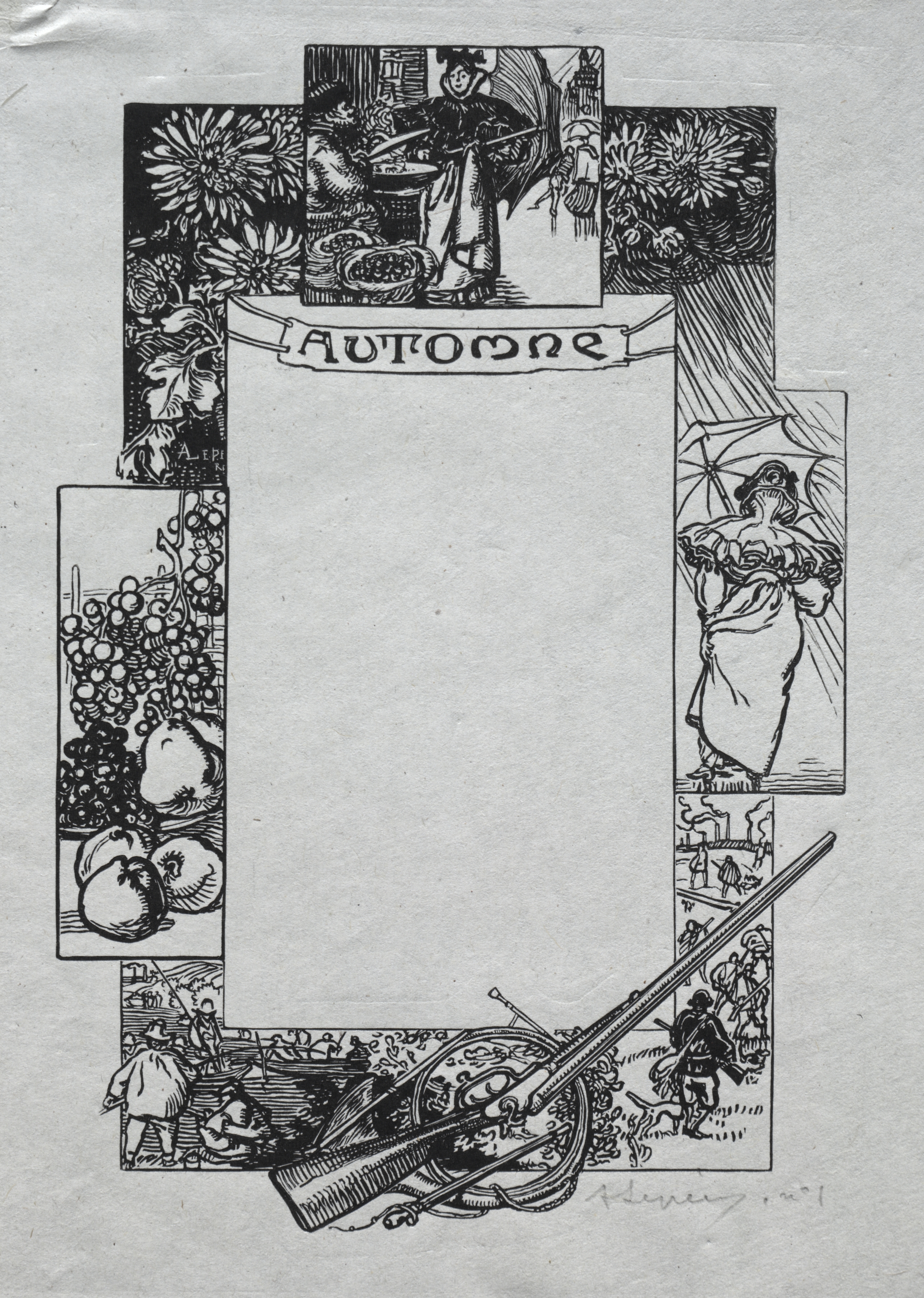 Black and white illustration of a decorative border. The border is made up of multiple rectangular frames. Top frame contains a woman standing at a table with a basket and a large jug. The woman wears a long dress and a head covering. The frame is flanked by flowers on either side. Below the top frame is a banner with the word "AUTOMNE". Left frame contains a still life of fruit and vegetables. Right frame contains a woman standing under an umbrella and a smaller frame below with a landscape scene. Bottom frame contains a rake and other garden tools. The background of the image is a light gray color. The artist's signature is in the bottom right corner. The word "AUTOMNE" is written in a decorative font on the banner.
