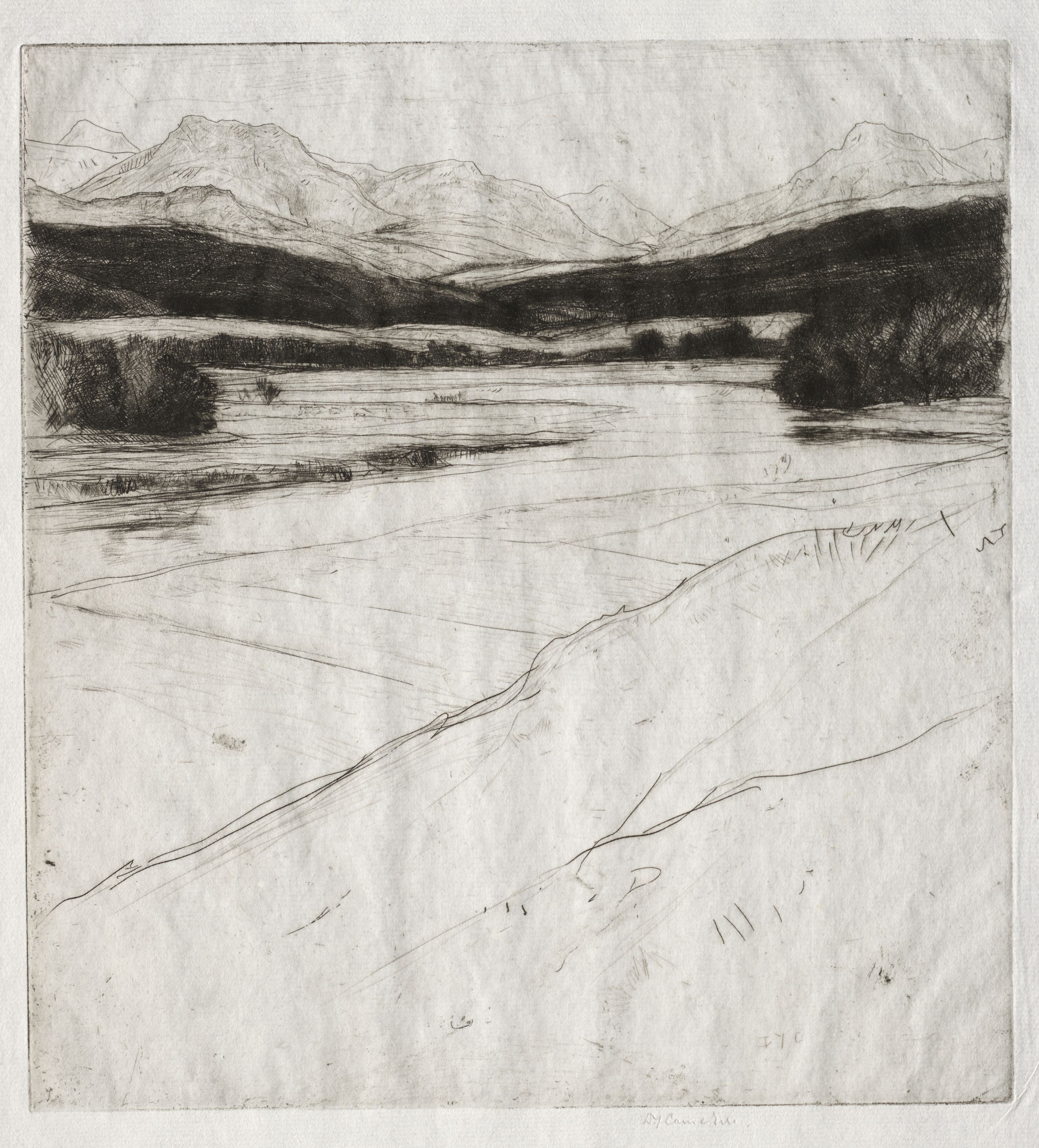 Black and white landscape etching, rectangular with a landscape orientation. The scene features a view across a body of water, with a dark area of land on the horizon line filled with trees and bushes towards the center and right. On the horizon are several large hills with the largest one on the left side. The body of water appears to be quite calm with no visible waves. The foreground features a grassy hill on the right with sparse vegetation and several long scratches etched into it. The sky appears to be a light grey color with no visible clouds. The entire scene appears to be etched in a simple yet detailed style. The title reads "Hills of Tulloch" and the artist is "David Young Cameron".