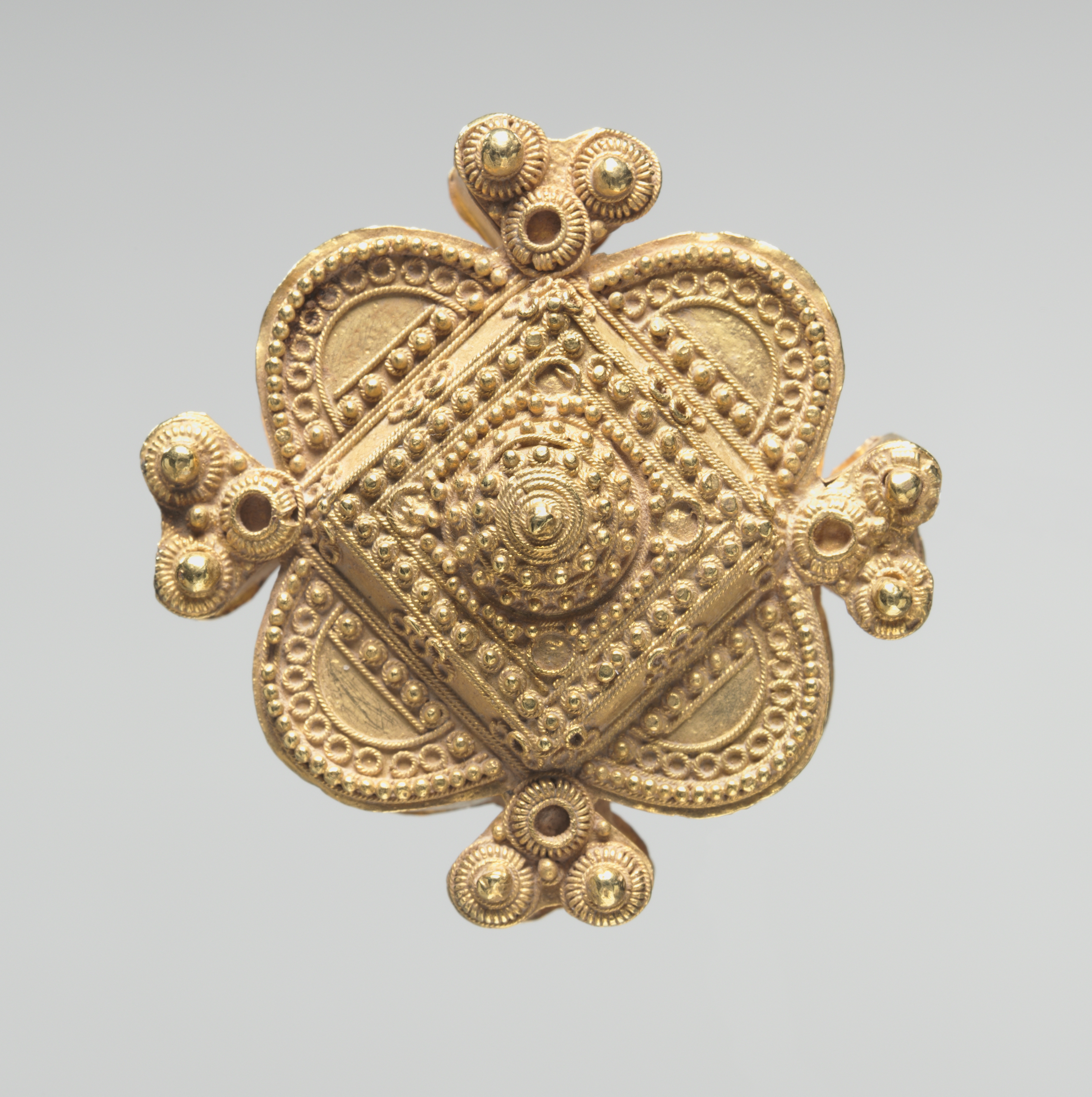 Gold pendant in the shape of a four-leaf clover. The pendant has a central square with rounded corners, decorated with granulation. A circle in the center, surrounded by a square with concave sides and four half circles on the sides. Four protruding shapes with three gold balls each. The background is gray. The pendant is titled "Pendant with Granulation" and the artist is unknown.