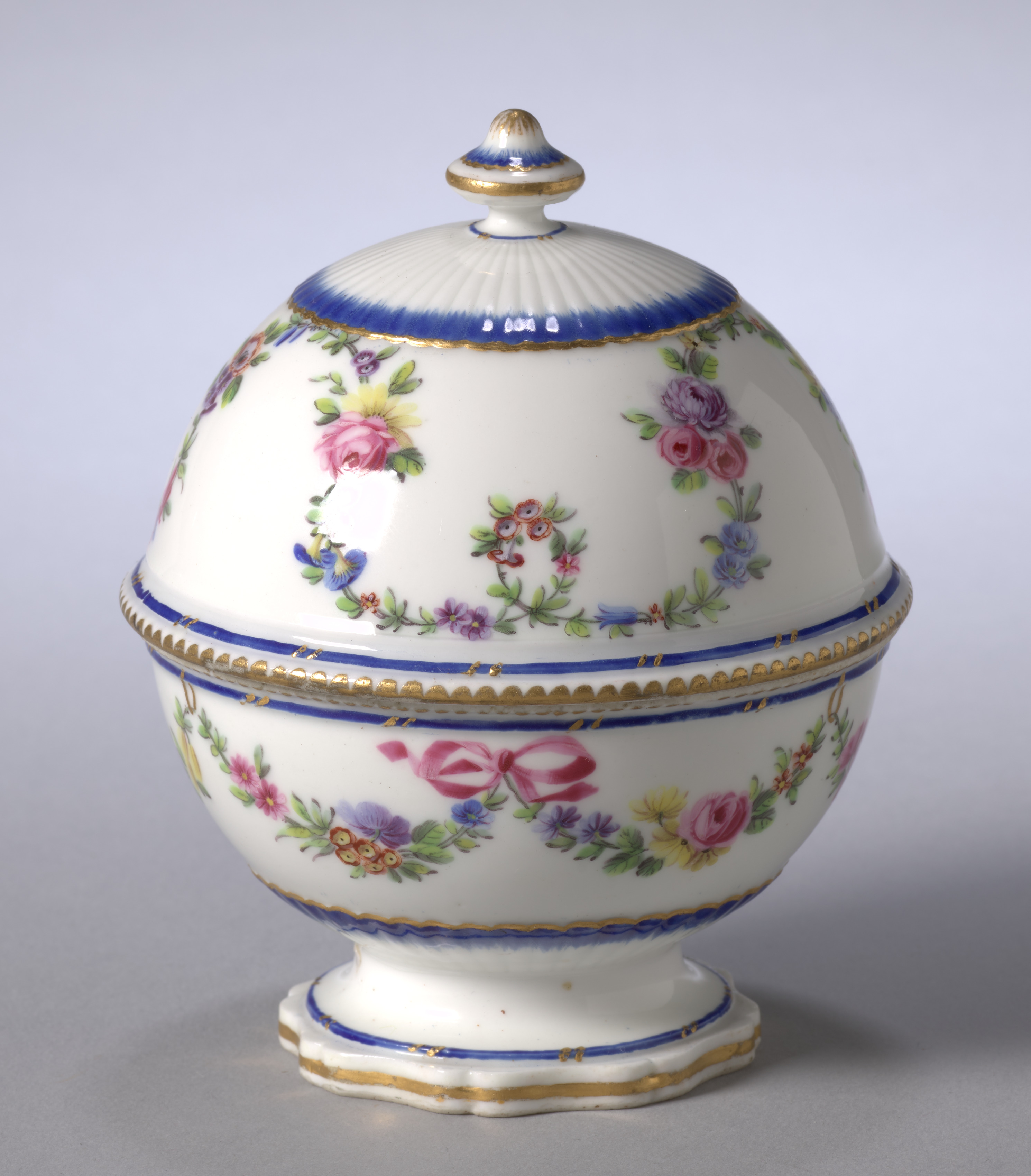 White porcelain container with a domed lid and a short pedestal base. The container has a wide body that tapers in at the top and bottom. The body and lid are decorated with colorful floral patterns. There are blue bands around the middle and bottom of the body and around the edge of the lid. The blue bands have gold trim. The lid has a small finial on top. The background of the image is gray. The container is titled "Soap Box" and is by "Sèvres Porcelain Factory".