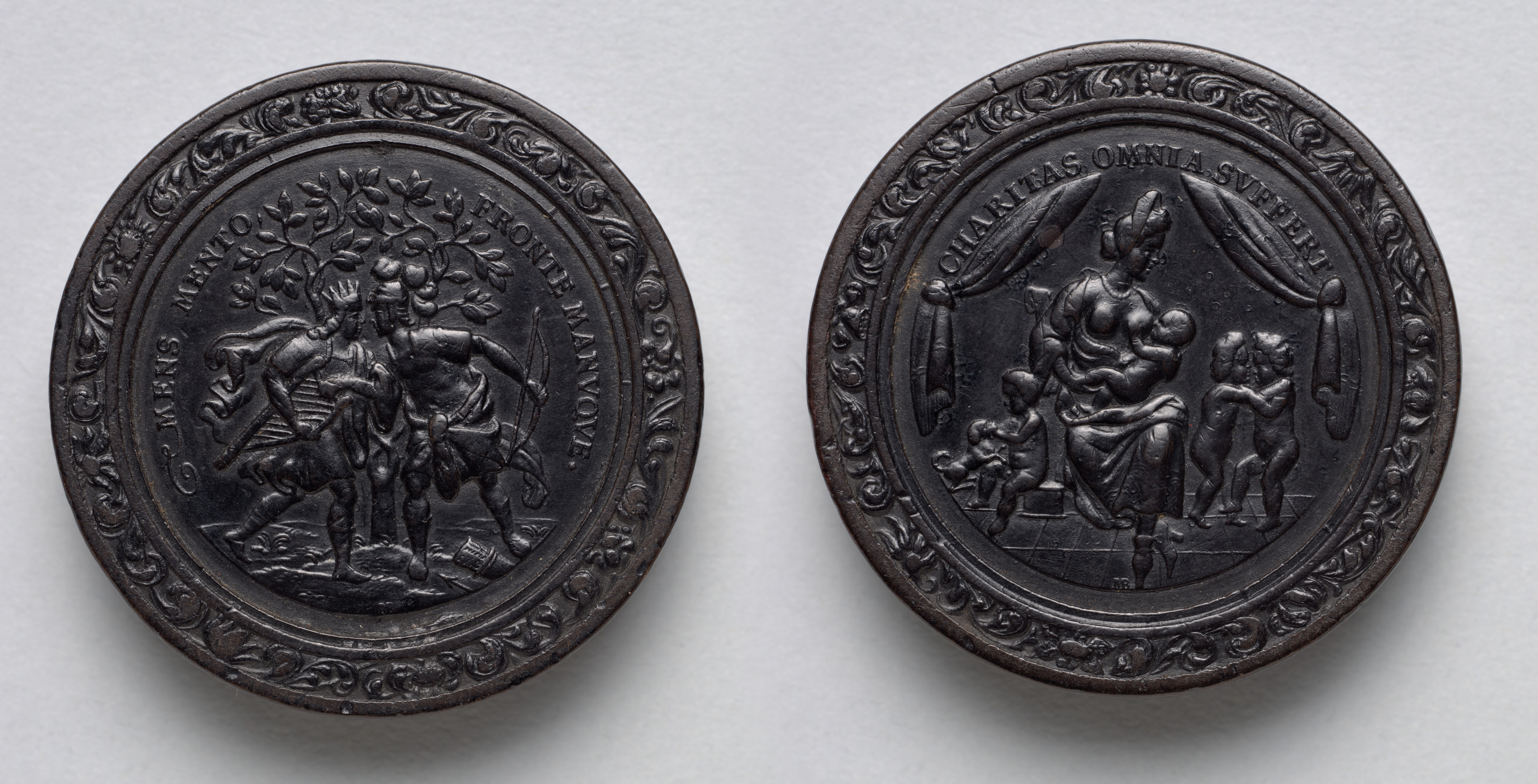 Dark metal gaming piece by Martin Brunner. Two round medallions. Both have decorative borders. One medallion shows two men carrying another man. The man on the left has his arm around the carried man's waist and his hand on the carried man's chest. The man on the right has his arm around the carried man's legs. The carried man has his left arm raised. A tree behind them. Words around top border. The other medallion shows a woman sitting with a child on her lap. A curtain behind her. Two men on either side. Words around top border. Gray background.