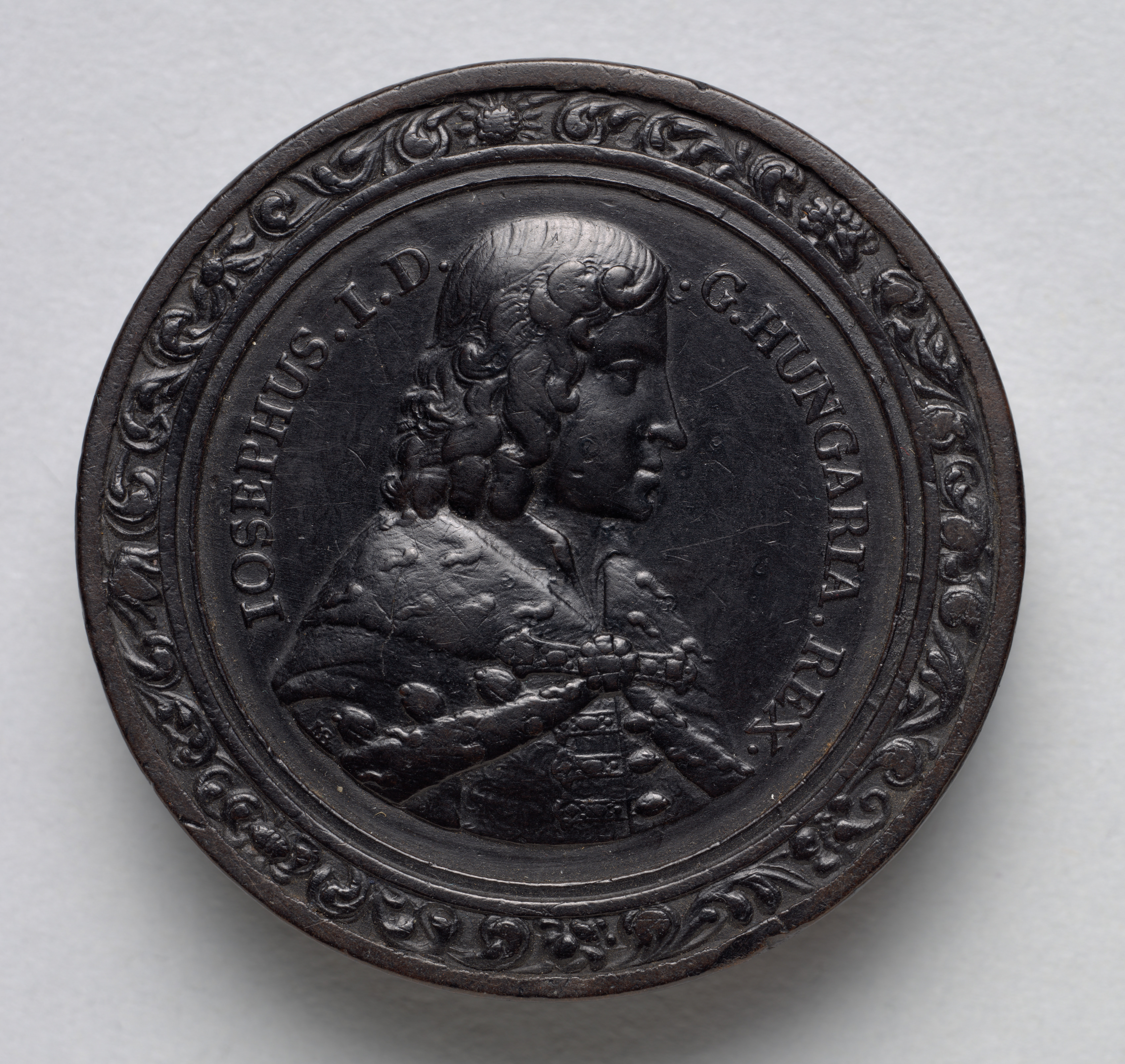 Dark gray circular object with a raised design. The raised design features a portrait of a man. Man has large curled hair and is wearing a jacket. Two lines of text on either side of the man's head read "JOSEPHUS I.D.G.HUNGARIAE REX". Object has a decorative border around the edge. The decorative border consists of curved lines and shapes resembling leaves or flowers. Object appears to be made of metal. Object is photographed against a plain white background.