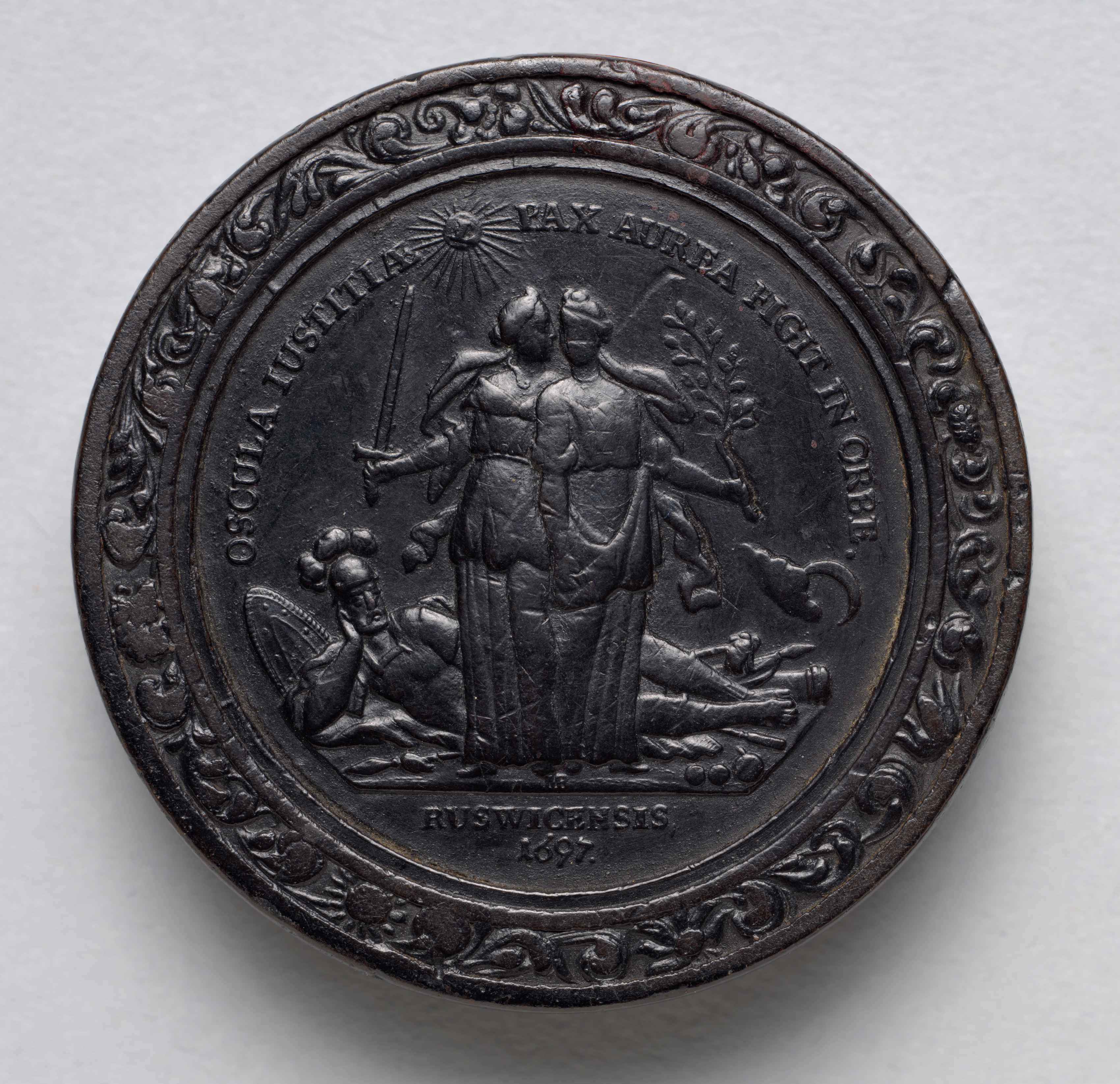 Dark metal medallion with raised design. Circular with ornate border of leaves and flowers. Central scene depicts three figures. A standing muscular male figure with a sword in the right hand, and a plant in the left. He wears a helmet and a long cloth robe. A sunburst behind his head. A second figure kneels on the left, with a shield and sword. A third figure lies on the ground on the right. Two lines of text arc around the top. Bottom text reads "RYSWICKENSIS 1697". The background is light gray.