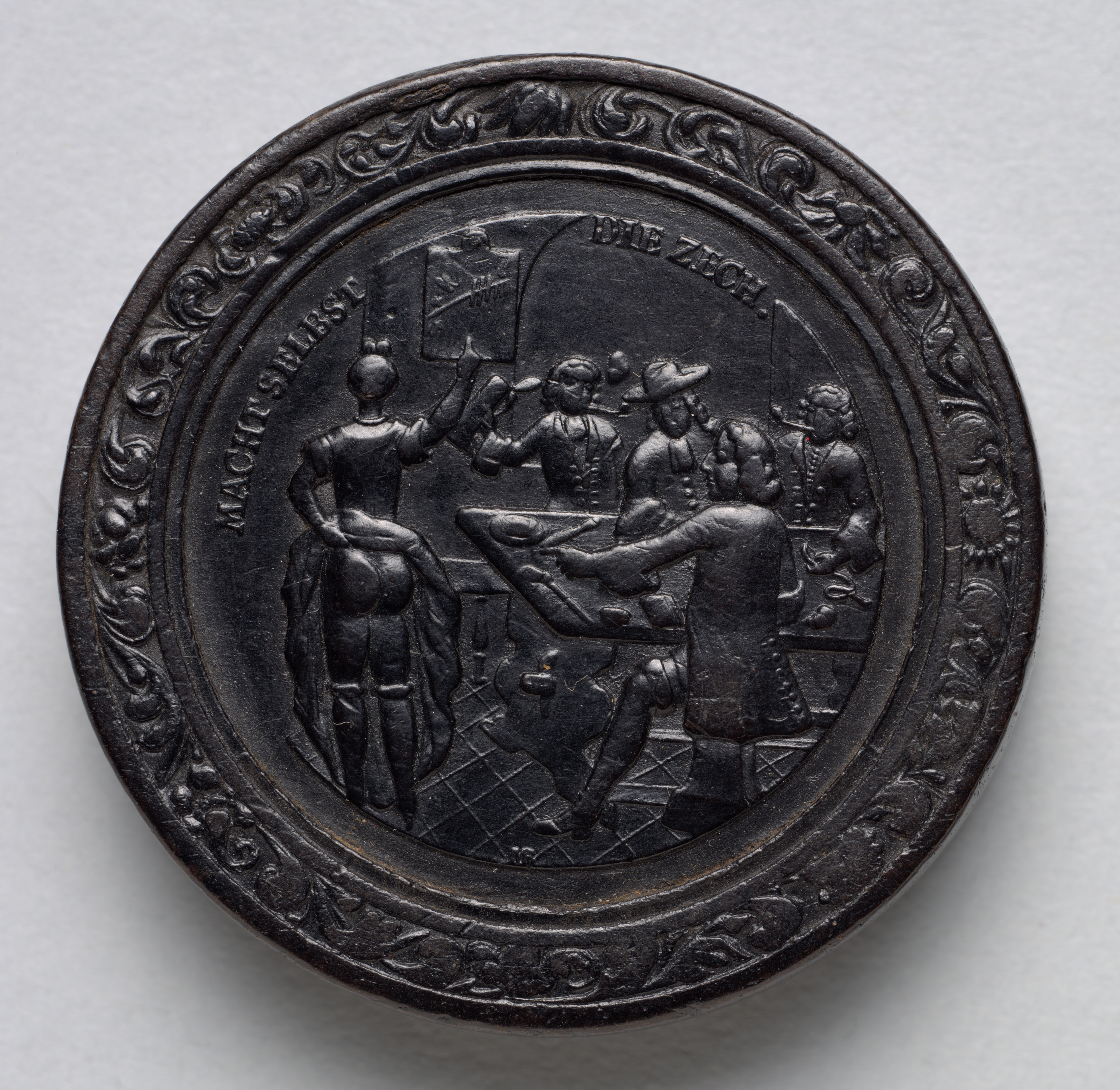 Dark metal medallion with raised design; circular; ornate border around edge; scene in center depicts people in hats and old-fashioned clothing; one person standing on left; three people around table on right; one person kneeling; decorative text on upper left and right; background gray.