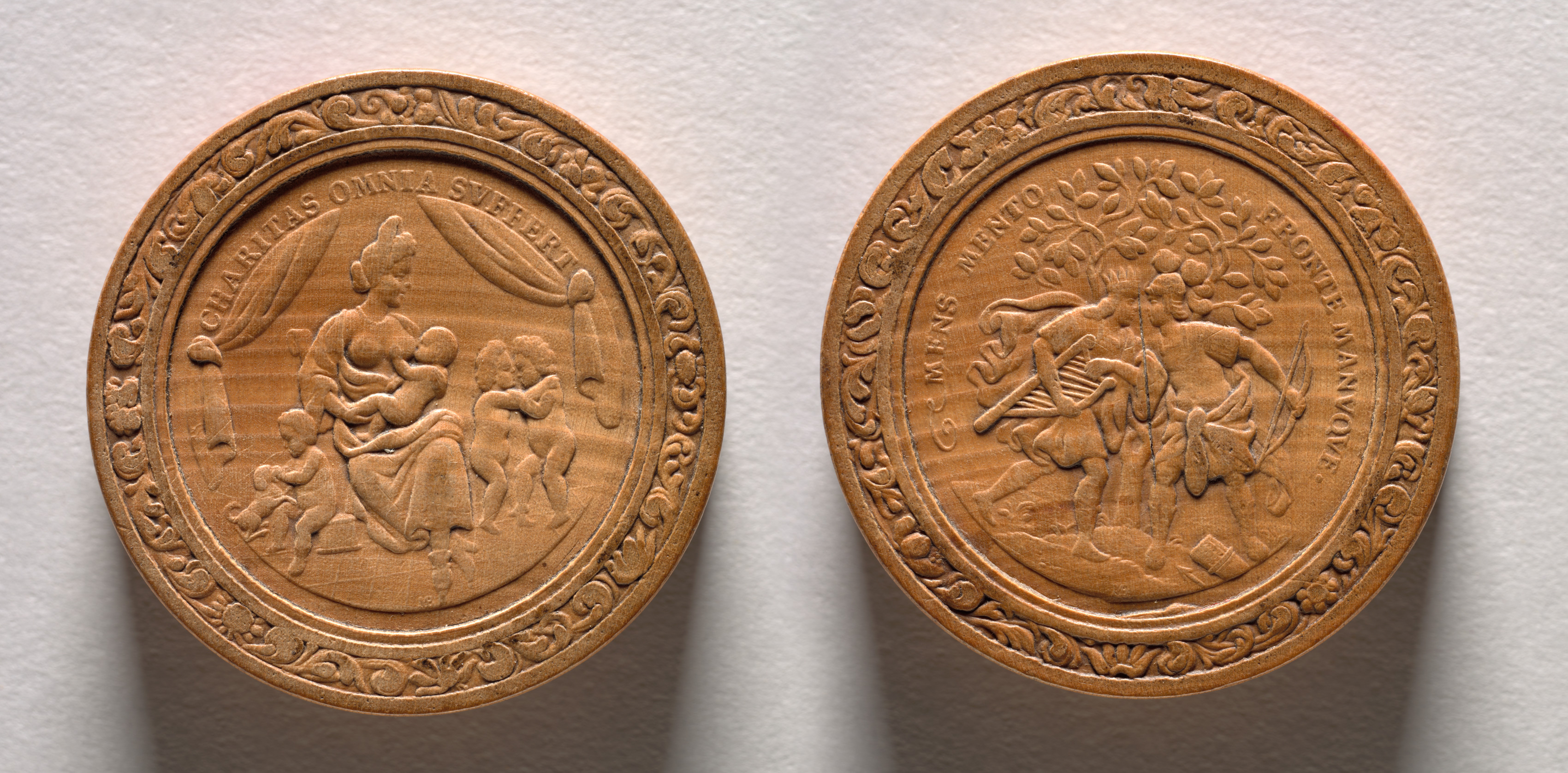 Two round, flat, brown objects with raised designs. The object on the left features a woman sitting and holding a baby, with two children on either side. A curtain is behind the woman. The object on the right shows a man and a woman standing under a tree. The man holds a bow and arrow. Both objects have a border with writing and decorative elements. They are on a white surface. The title is "Gaming Piece" and the artist is Martin Brunner.
