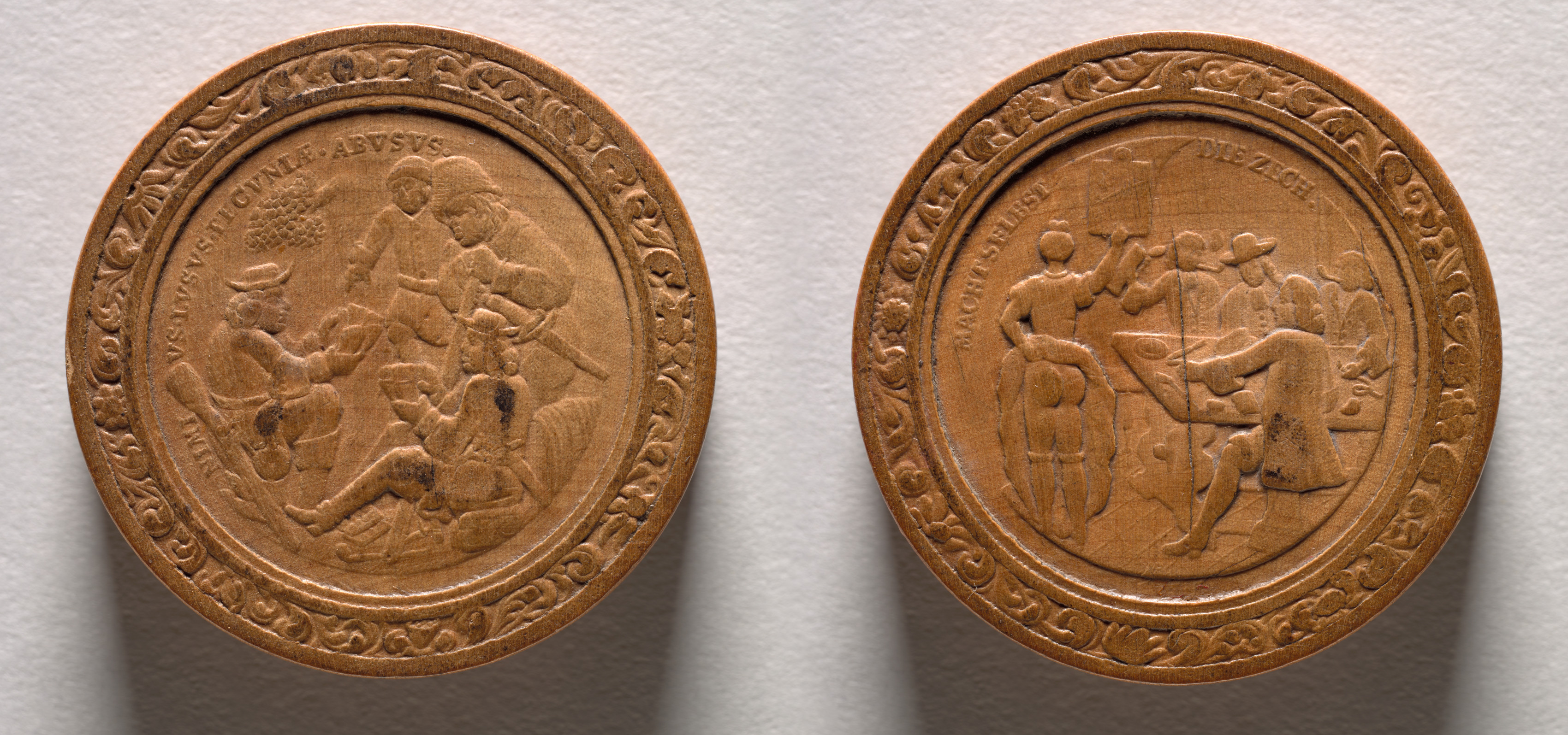 Two round, flat, brown objects with raised designs. The objects are side by side on a white surface. The objects have a raised border around the edge. The left object shows a group of people, some sitting and some standing. The right object shows two people. The person on the left is standing and the person on the right is sitting. The standing person holds a cross-like object. The objects appear to be made of a material with a texture. The background is white with shadows cast by the objects. The objects are titled "Gaming Piece" by Martin Brunner.