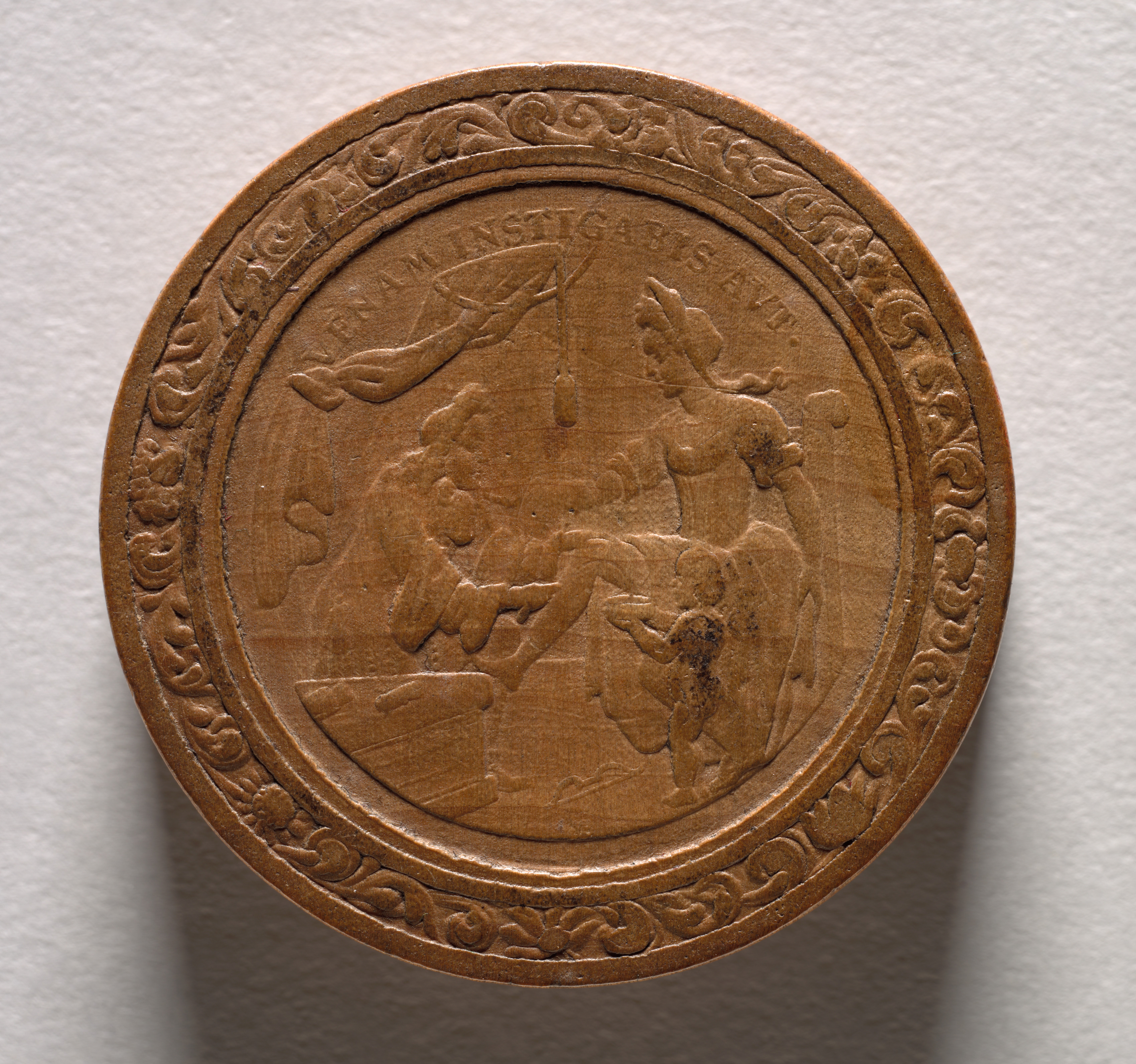 Round, brown, carved gaming piece with a raised design on a white background. The design features a scene with 3 figures and some text. The outer edge has an ornate border. The figures appear to be in a dynamic pose. One figure on the right is on horseback. The figure on the left appears to be sitting or falling. A third figure is in front. The text at the top is curved. The entire piece has a textured surface.