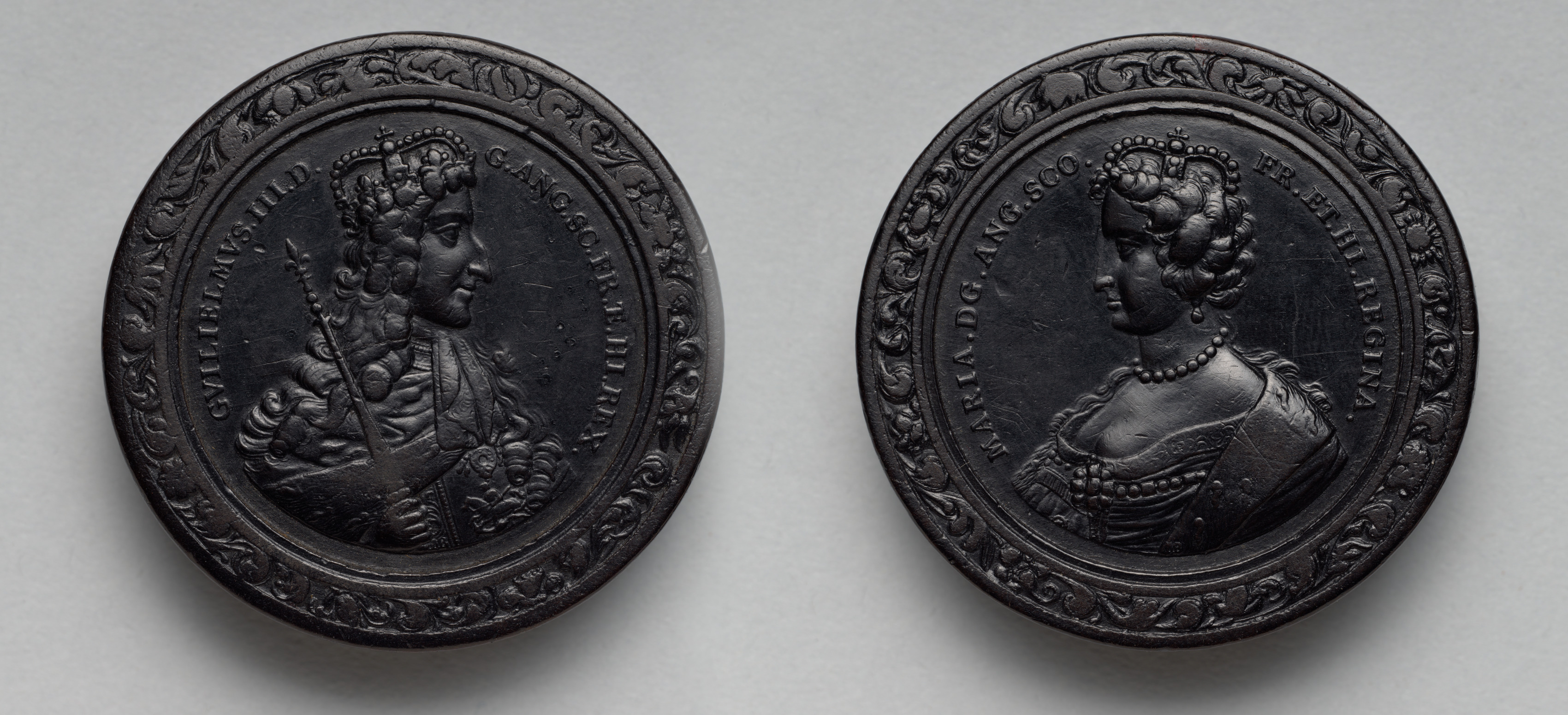 Dark gray or black, two round, flat, medallion-like objects. The objects have a raised edge with decorative pattern. The left medallion features a raised image of a man with curly hair wearing crown, a cape and holding a scepter. The man faces right. The text on the left medallion reads "GULIELMUS IIII" at top left, "KING OF" at top center and "GREAT BRITAIN FRANCE & IRLAND" along the upper right. The right medallion features a raised image of a woman with curly hair wearing pearls. The woman faces right. The text on the right medallion reads "MARIA DG ANG & SCO" at top left, "QUEEN" at top center and "OF GREAT BRITAIN FRANCE & IRLAND" along the upper right.