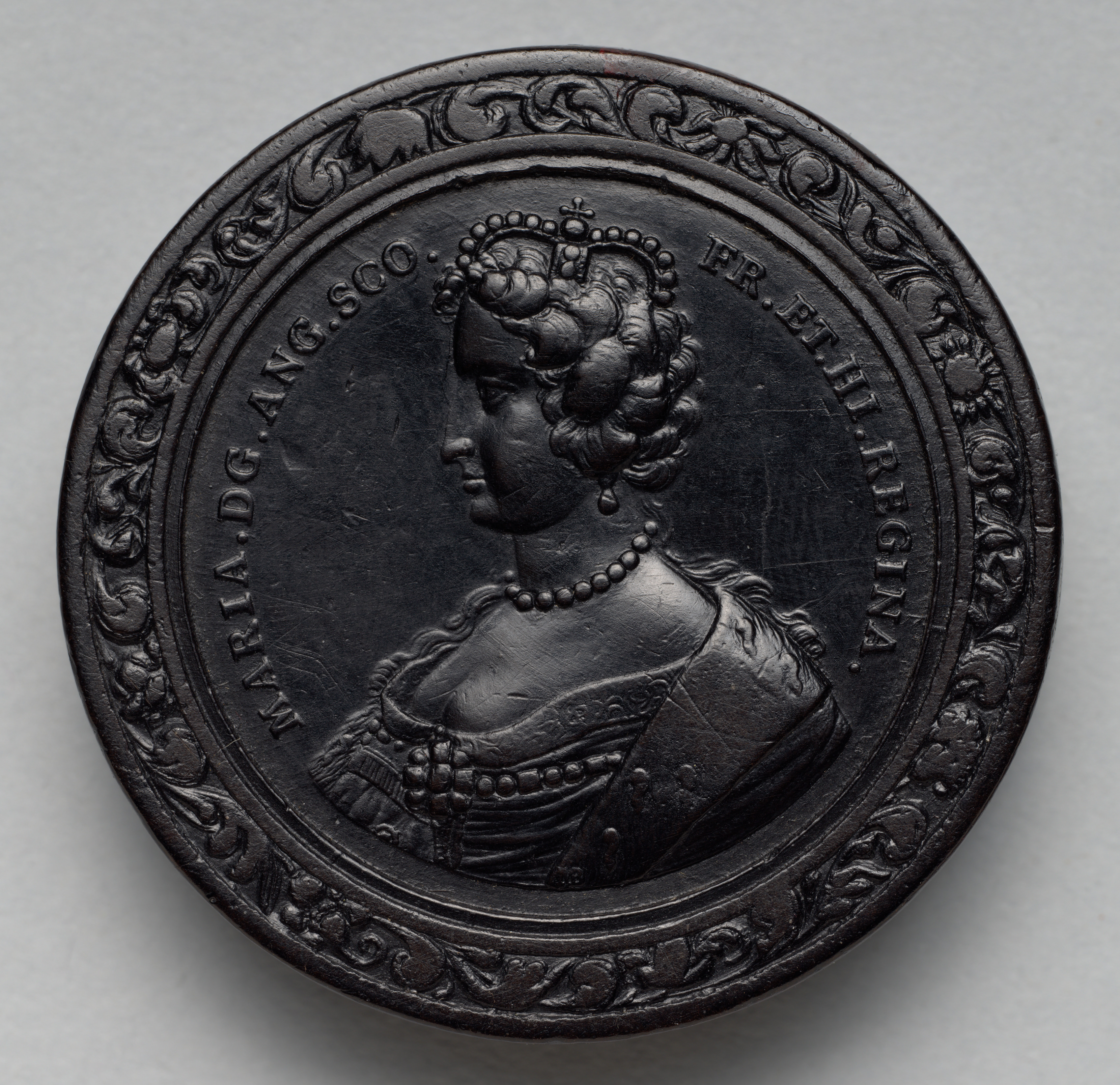 Black, circular, raised relief sculpture of woman's head and shoulders. The woman has short, curly hair, a pearl necklace and earrings, and a pearl and fabric headdress and dress. The woman faces left. The sculpture has a raised, decorative border. The border contains leafy, curving designs. The words "MARIA.DG.ANG.SCO.FR.ET.HIB.REGINA" are raised and in an arc above the woman's head.