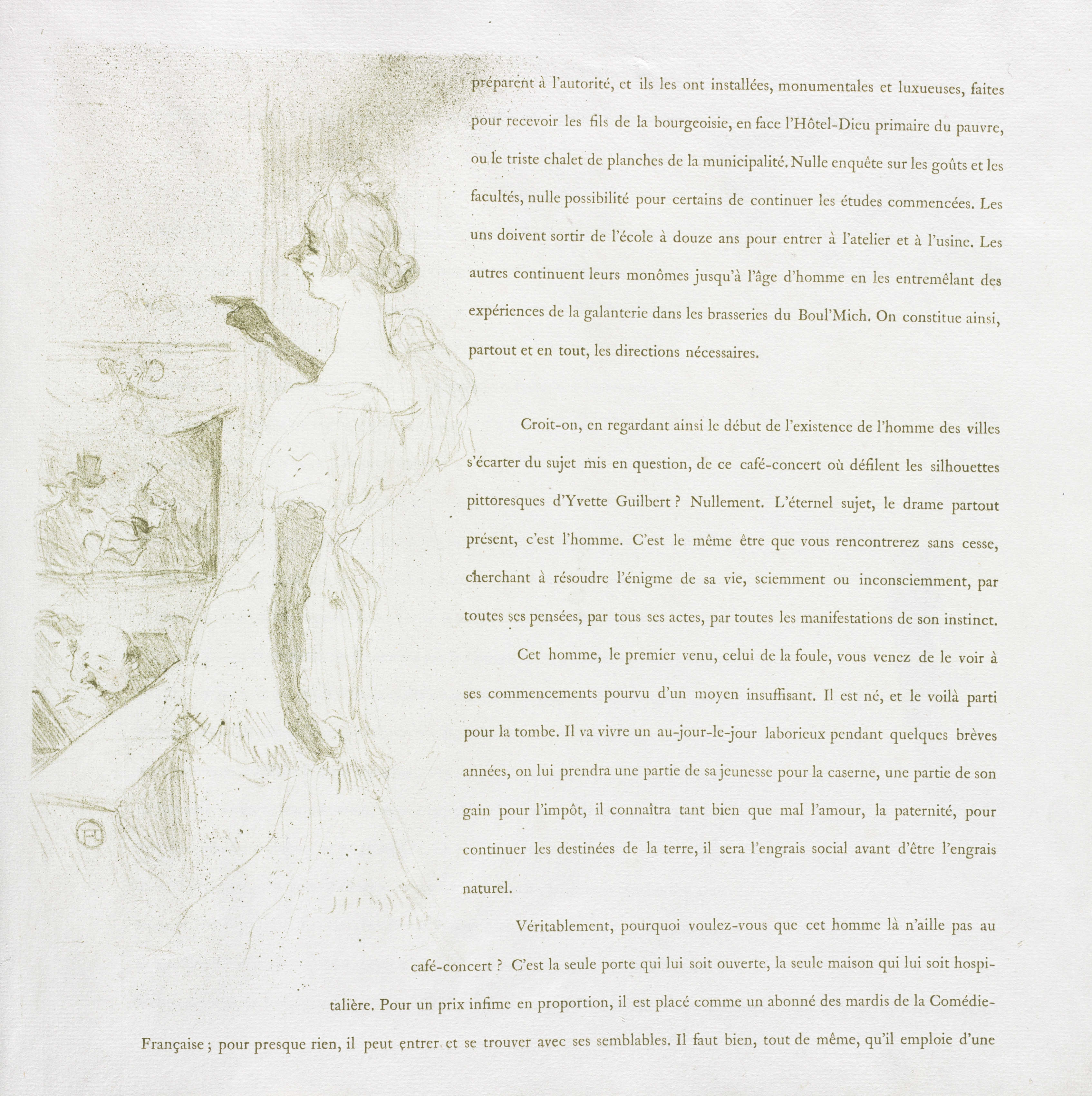 The image shows a sketch of a woman on the left with a block of text on the right. The woman's body faces right and she looks left. The woman wears a dress with puffy sleeves; the waist of the dress appears tight and then there is gathered fabric below. The woman has an updo. A smaller sketch appears to be in a frame behind her. There are six lines of text at the bottom but not visible. The rest of the text appears in a large block on the right. The title of the image is "Yvette Guilbert-French Series: No. 6" and the artist is "Henri de Toulouse-Lautrec". Search terms: woman in dress, woman with updo, puffy sleeves, sketch, illustration, black and white, French text.