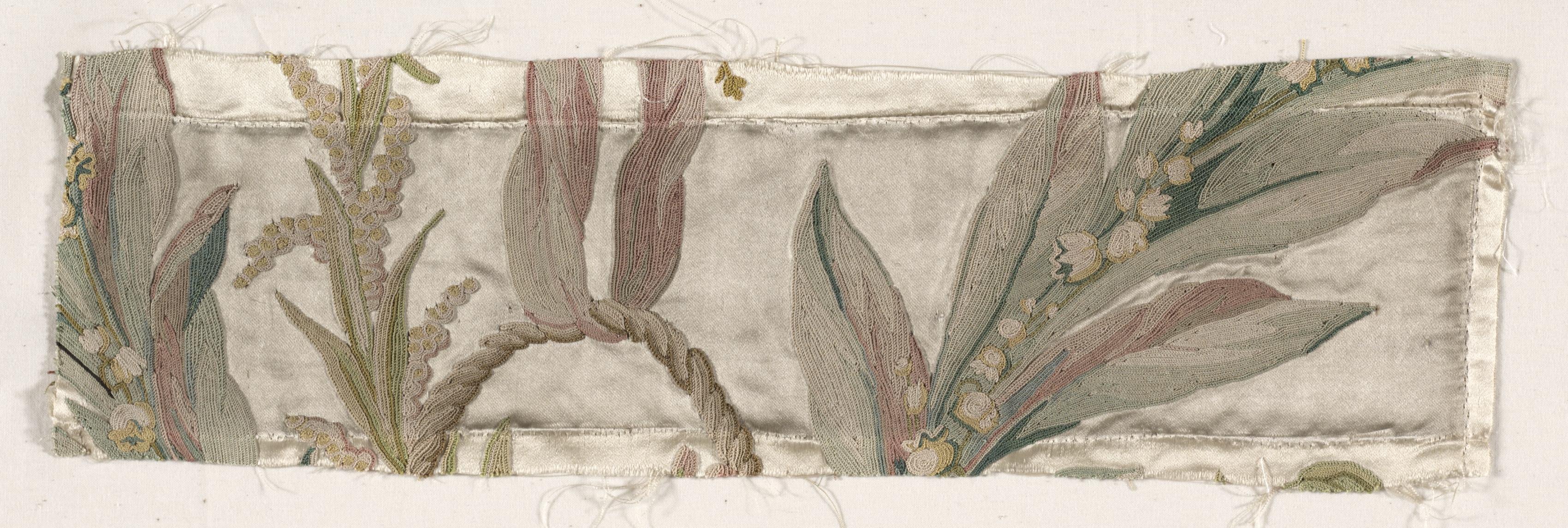 Coverlet Fragment by Philippe de Lasalle. Rectangular piece of fabric with frayed edges. The fabric features a design with leaves and flowers in shades of green, pink, and gold on a cream background. The leaves are long and thin, some with pointed tips, and the flowers are small and clustered. The fabric appears to be made of silk or a similar material. The edges of the fabric are rough and uneven, suggesting that it has been cut or torn. The background behind the fabric is plain and off-white. The overall design is intricate and ornate, with detailed stitching and patterning. The fabric is likely a fragment of a larger textile, possibly a coverlet or other decorative item.