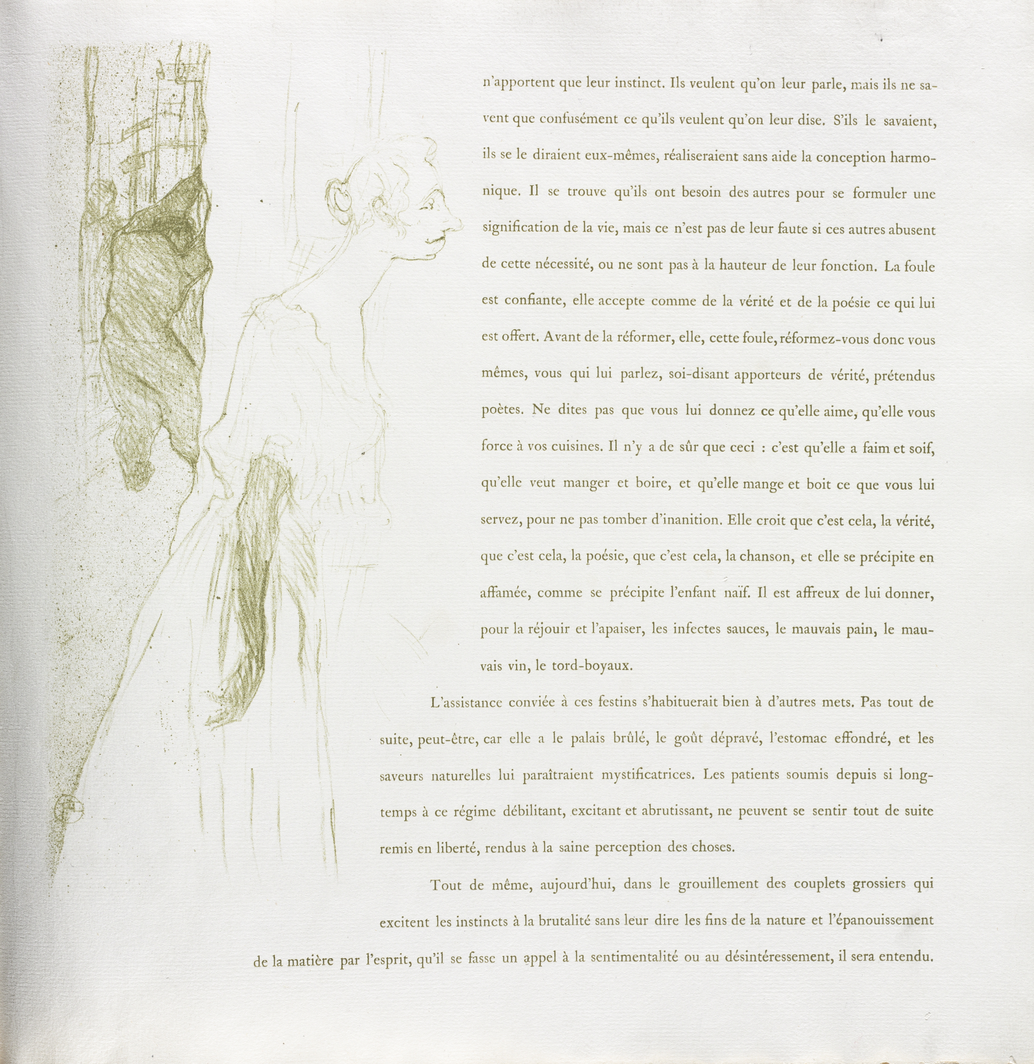 The image shows a sketch of a woman in a dress on the left side and French text on the right. The woman is drawn in greenish-brown pencil. She has short hair and is wearing a long dress. The dress appears to have a low neckline. The woman's body is angled to the right, with her head turned to the right. The text is written in black and is divided into paragraphs. It appears to be an article or essay. The text is in French. The background of the image is off-white, with a slightly textured appearance.
