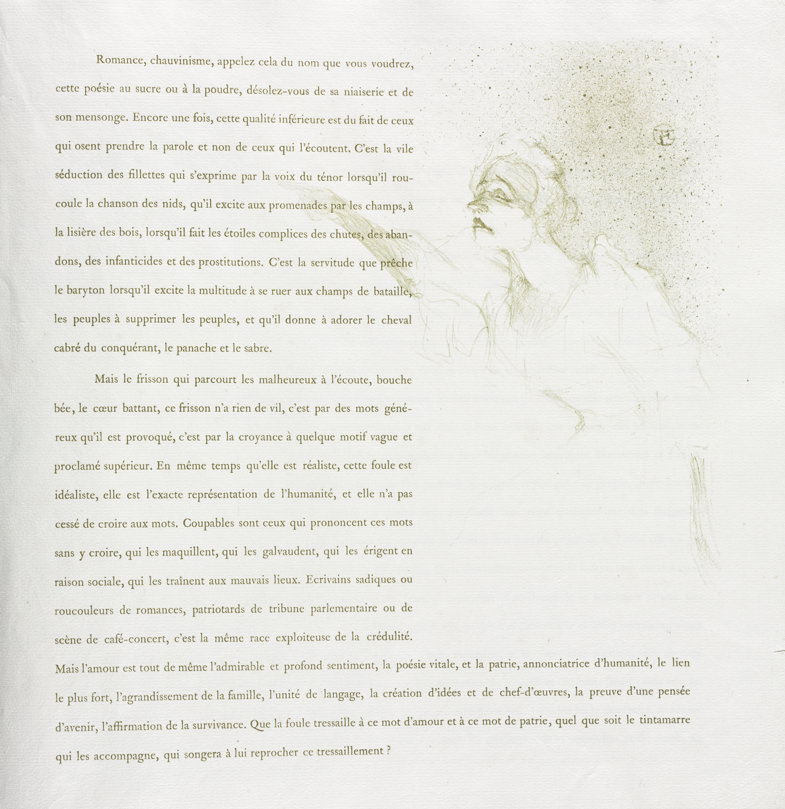The image shows a woman's head drawn in greenish-brown on the right edge. The woman's face and hair are drawn in profile, facing left. Her hair is pulled back. She appears to be looking down. The background of the drawing is a light-colored paper texture with flecks of darker greenish-brown. The drawing appears to be done in a sketch-like style. The rest of the image contains black printed text in a foreign language, likely French, on the left side and center. The text is in paragraphs.