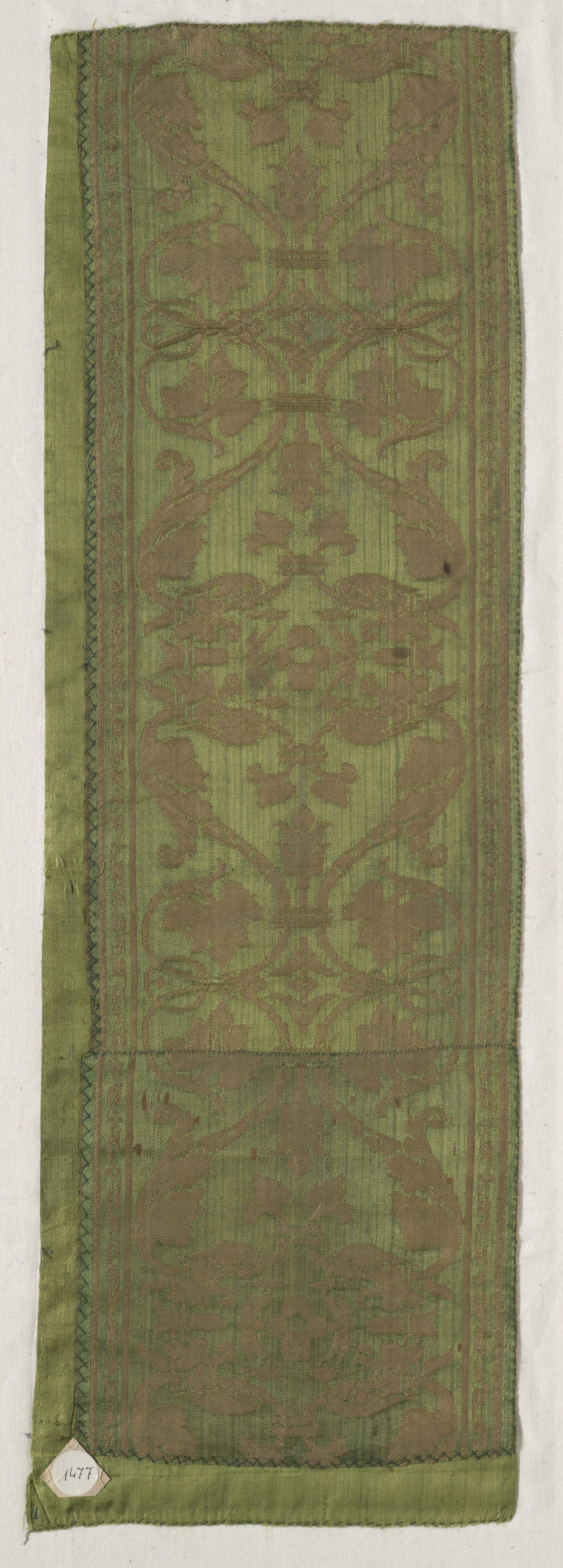 Green silk fragment with a brown design. The fragment is rectangular with a scalloped edge on the left side. A thin border runs along the edges. The design features a repeating pattern of symmetrical, curved shapes resembling leaves or flowers. The pattern is divided into sections by thin lines. A small white tag is attached to the bottom-left corner. The background of the image is off-white. The artist and title of the piece is "Silk Fragment".