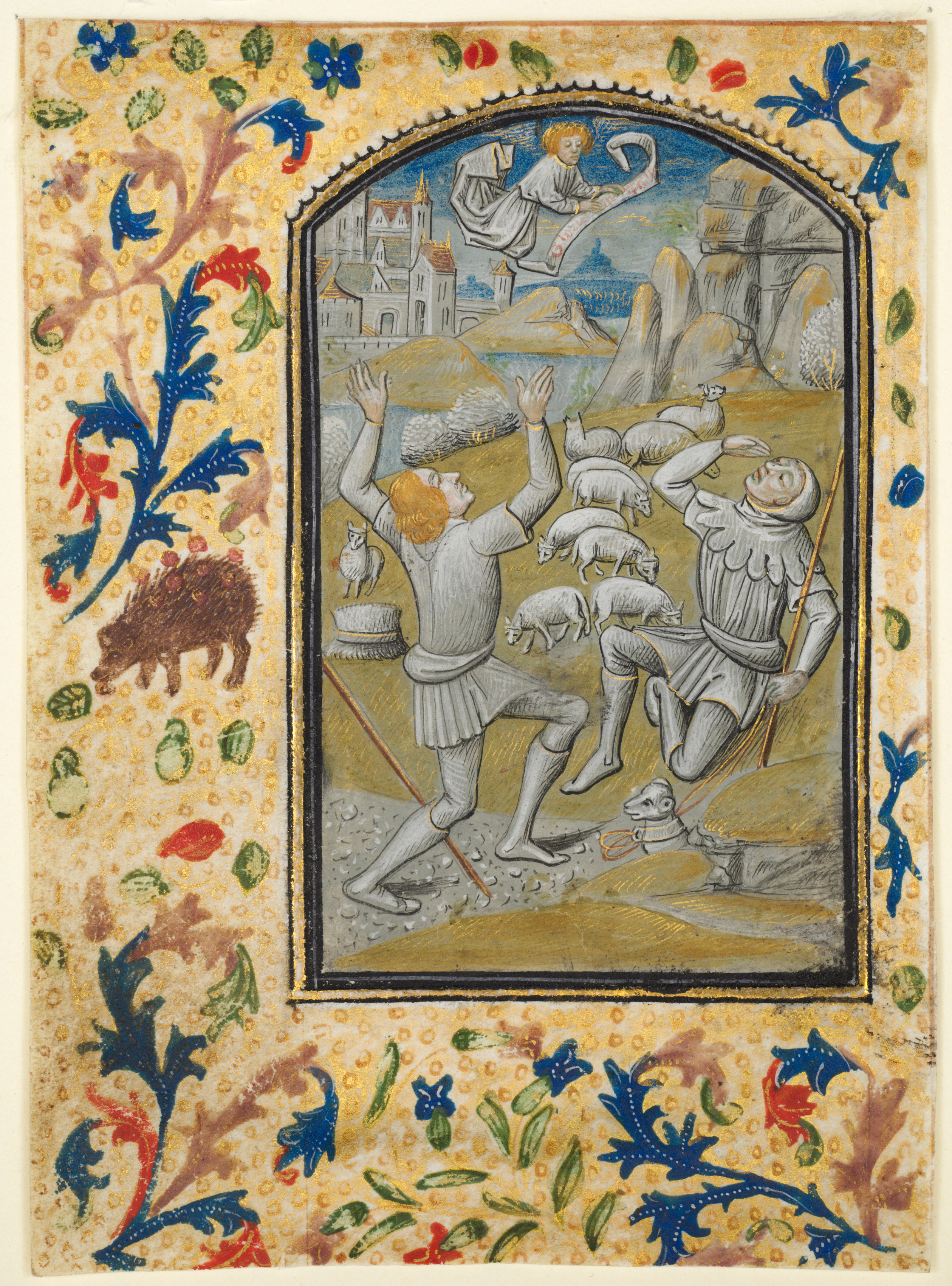 A medieval-style illustration depicting a scene from a book of hours. The scene shows two shepherds in a field with sheep, looking up at an angel flying above them, holding a long scroll. The shepherds wear white tunics and have orange hair. The shepherd on the left wears a short tunic and holds a long staff. The shepherd on the right wears armor and holds a shepherd's crook. The angel wears a white robe. The background of the scene features a blue sky, gray rocky cliffs, a distant town and white building. The scene is framed by an arched border with a black outline. The border around the illustration is yellow with a pattern of small circles. The border features a floral design with blue, green, and red flowers and leaves. A brown boar and an owl are depicted on the left side of the border. The illustration is rendered in a mix of gray, blue, green, red, orange, white, and yellow colors.
