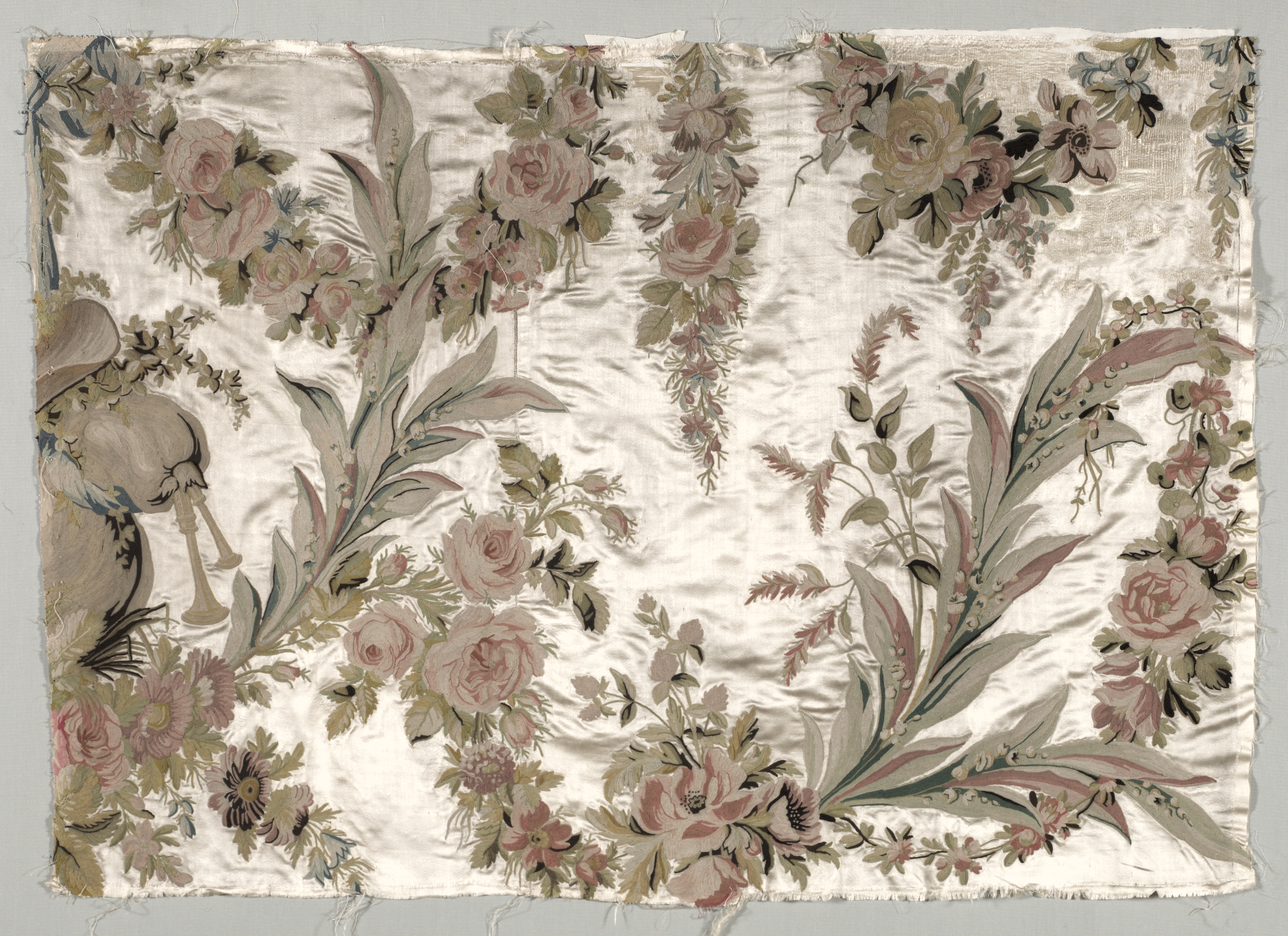 Coverlet Fragment by Philippe de Lasalle. This image shows a piece of fabric with a floral pattern. The fabric is rectangular with frayed edges. The background of the fabric is cream-colored. The floral pattern features pink roses, green leaves, and other flowers in shades of pink, green, and brown. The flowers and leaves are arranged in a random pattern across the fabric. The fabric appears to be made of silk or a similar smooth material. The overall design is intricate and detailed, with a mix of large and small flowers and leaves. The fabric has a slightly wrinkled appearance. It is set against a light gray background.