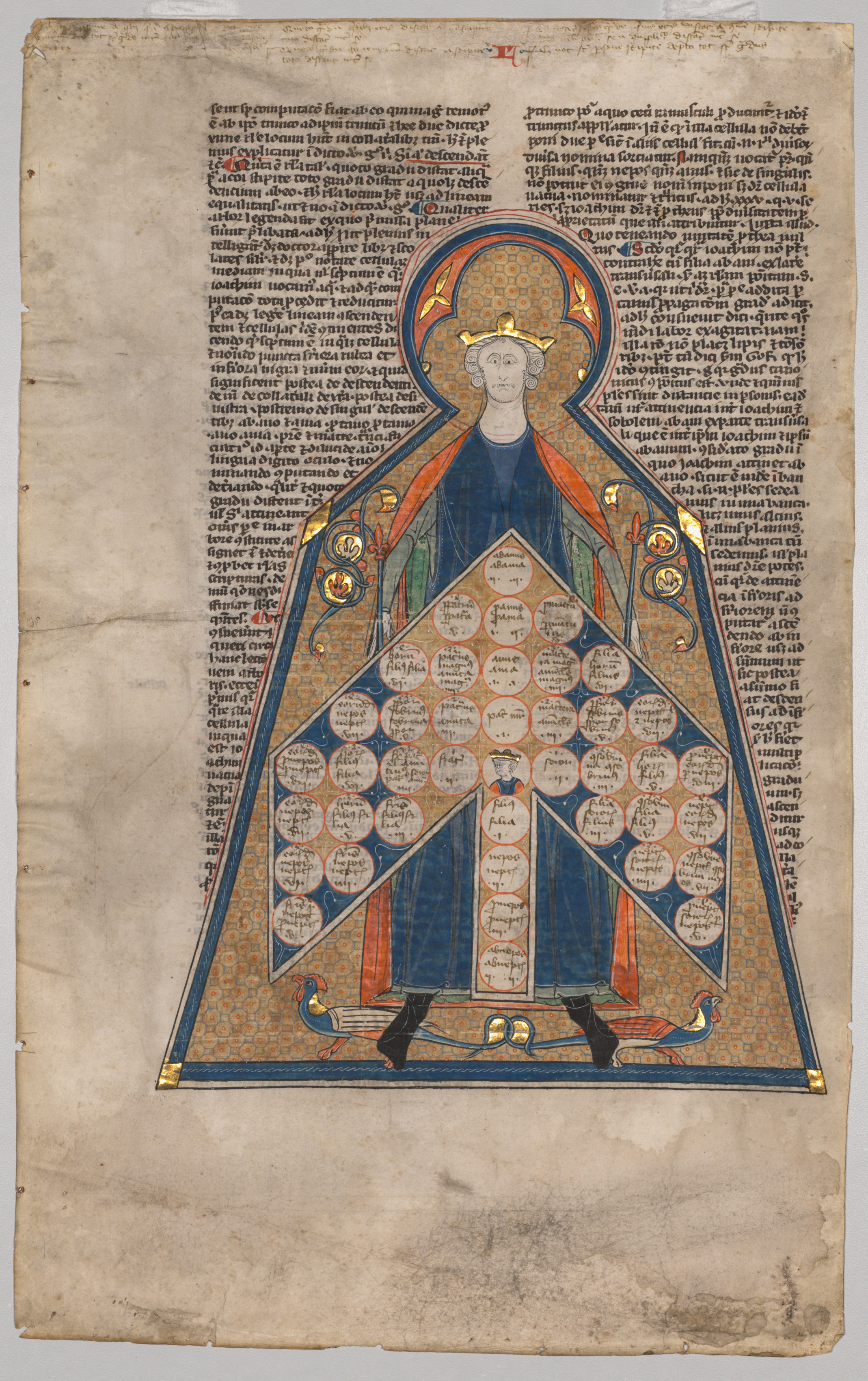 Medieval-style illustration of a man in a blue robe with orange and green lining; gold crown on head; large gold halo around head; standing in front of a table of consanguinity. The table is composed of various circles with writing in them arranged in a cross-like pattern. The man is standing on a beige background with a blue and gold border; columns of black text on either side of the illustration.