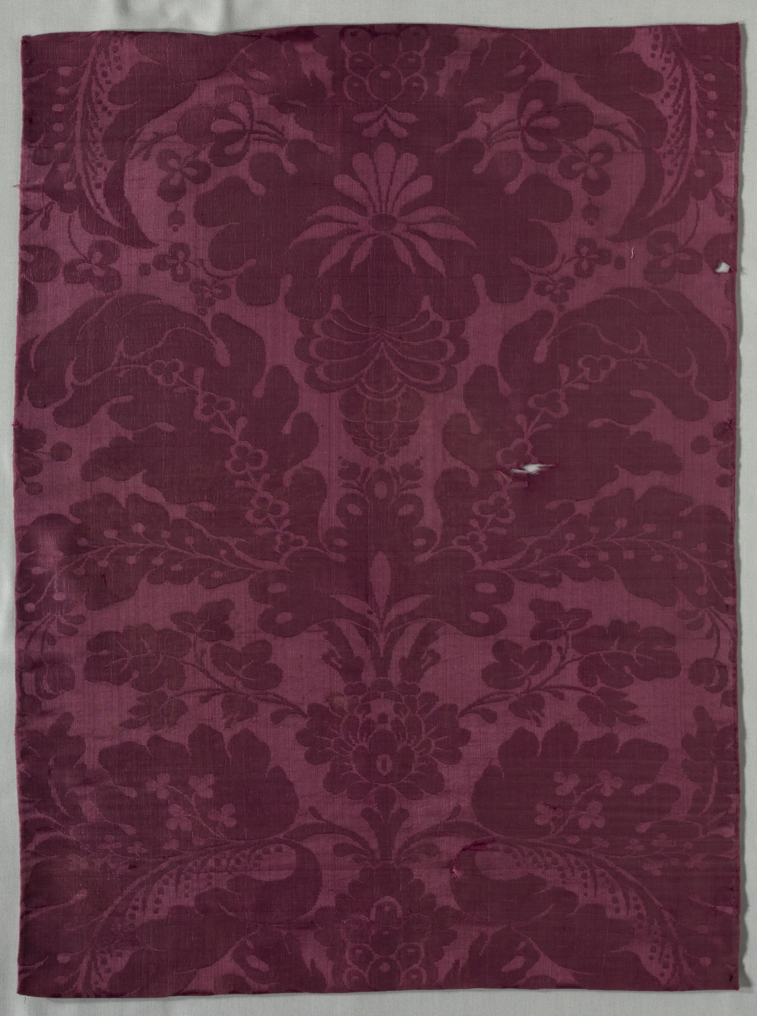 Length of Silk Damask. The image shows a square piece of fabric with a floral pattern. The fabric is a dark burgundy color. The floral pattern is made up of various sized flowers and leaves in a darker shade of burgundy than the background. The pattern is symmetrical, with a large flower at the top center and bottom center. Smaller flowers and leaves are scattered throughout the fabric. The fabric appears to be made of silk and has a smooth texture. There are two small holes in the fabric, one on the right side and one in the center. The fabric is laid flat on a light gray surface.