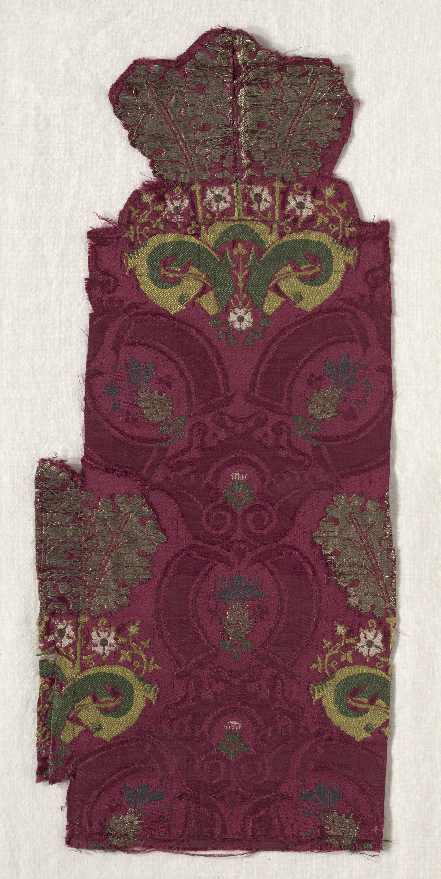 The Fragment of Silk Textile by artist, is a rectangular piece of fabric with a frayed edges. The fabric is primarily maroon in color with a repeating pattern of green, gold, and white designs. The top portion features a green section with a leaf-like design and a central seam. Below this, there are symmetrical green and gold curved shapes resembling leaves or flowers, accompanied by smaller white flowers. The main body of the fabric showcases a large, intricate design comprising concentric circles and teardrop shapes in maroon, green, and gold hues. The background against which the fabric is displayed appears to be a light-colored surface, possibly paper or cardboard. The fabric appears to be a textile fragment, likely from a historical piece of clothing or decorative item.