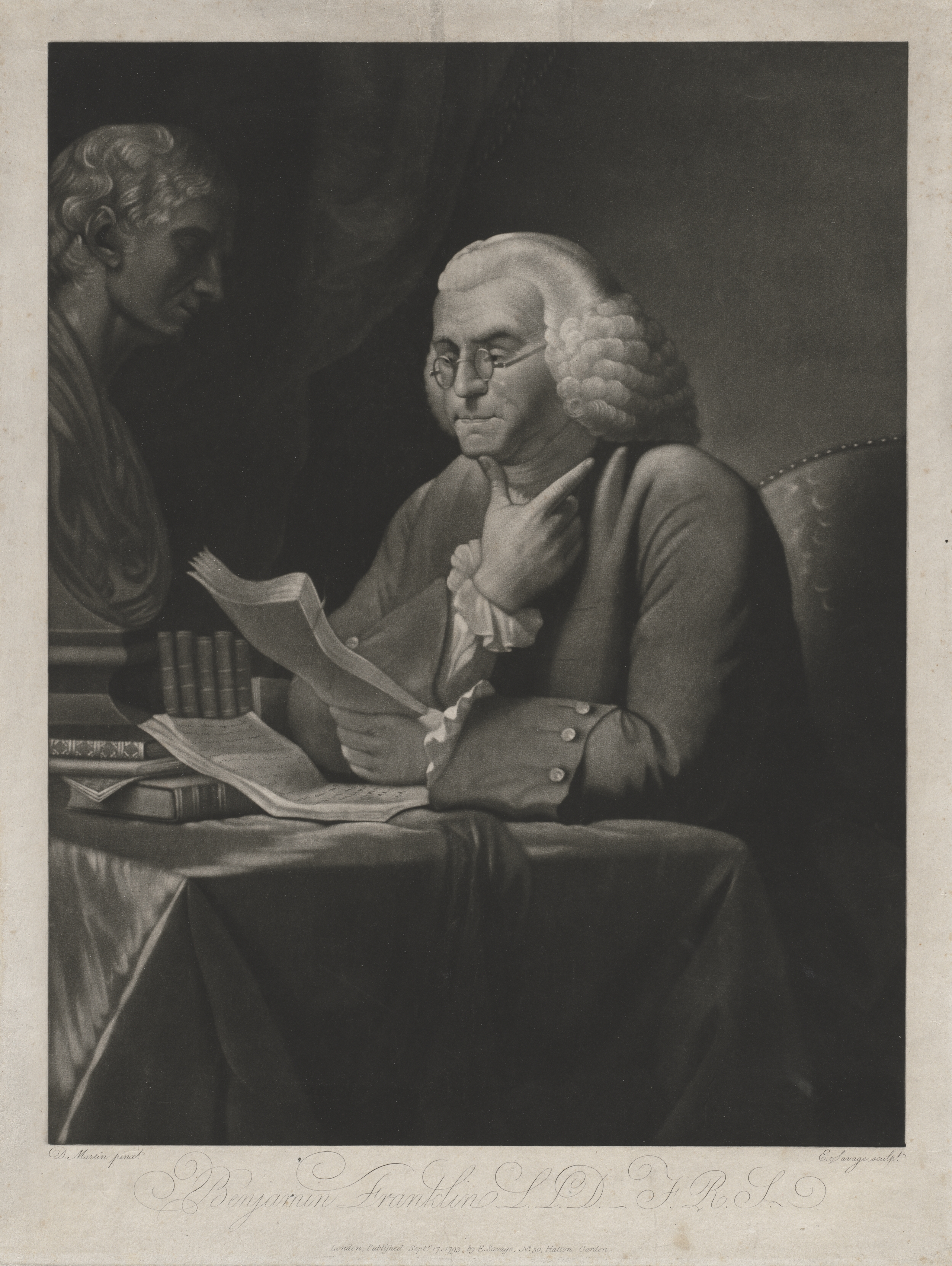 Black and white image of a man with white hair wearing glasses and sitting at a table, reading a paper. He sits to the right side of the image and wears a long-sleeved buttoned jacket with a white necktie. The table in front of him on the left holds more papers and several books with a bust of another man on it. The man on the left is shown from the shoulders up and wears a shorter wavy hairstyle. The seated man points at his neck with his right hand. He sits next to a chair. A line of cursive writing appears along the bottom.