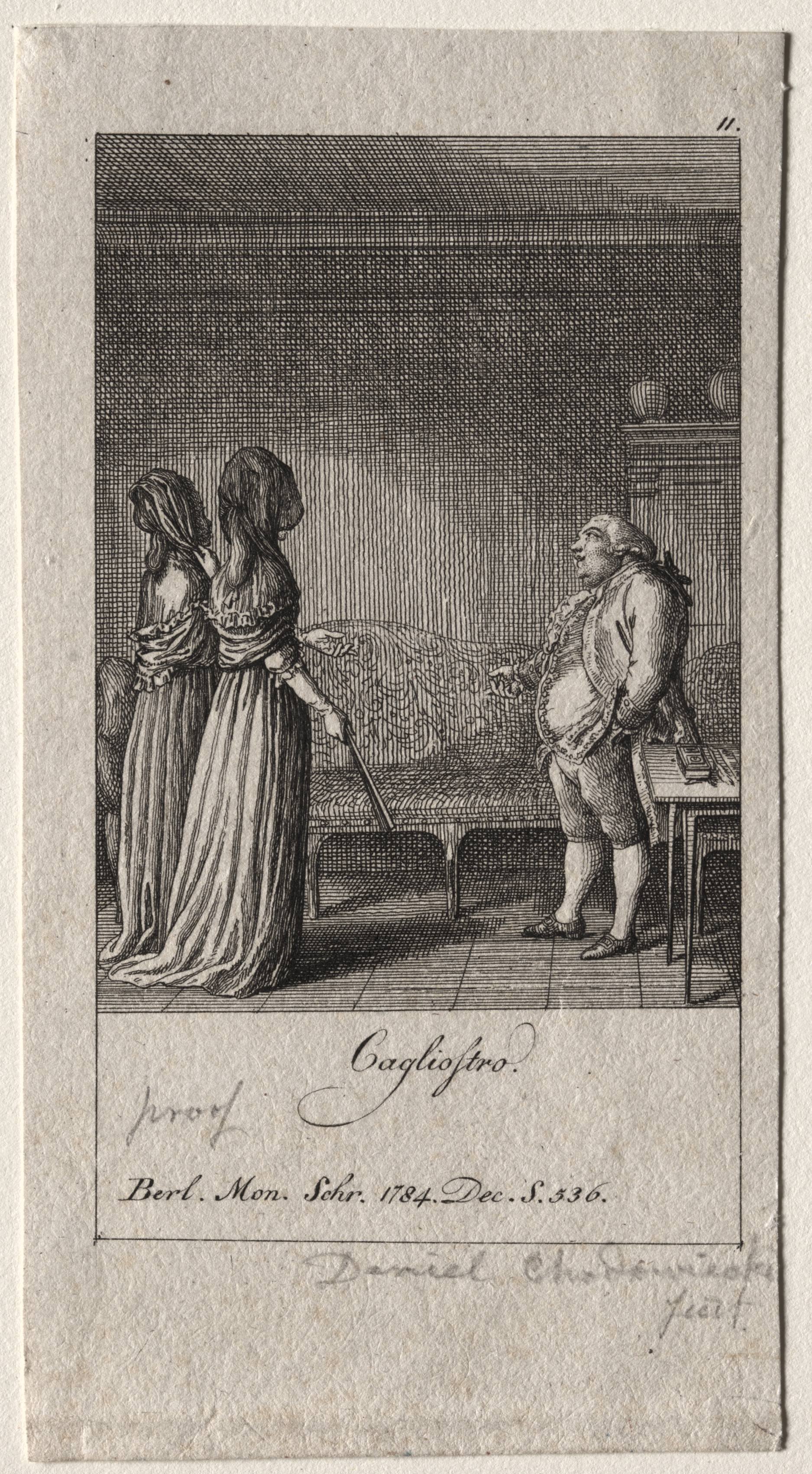 Black and white illustration of three people in a room. Two women stand on the left side of the image, wearing long dresses and head coverings. The woman on the right holds a walking stick. A man stands on the right side of the image, wearing 18th-century clothing, including a jacket, shorts, and socks. He looks at the women. A table and bench are behind him. The background shows a wall with a shelf containing three objects. Text at the bottom of the image reads "Cagliostro" and other illegible writing.