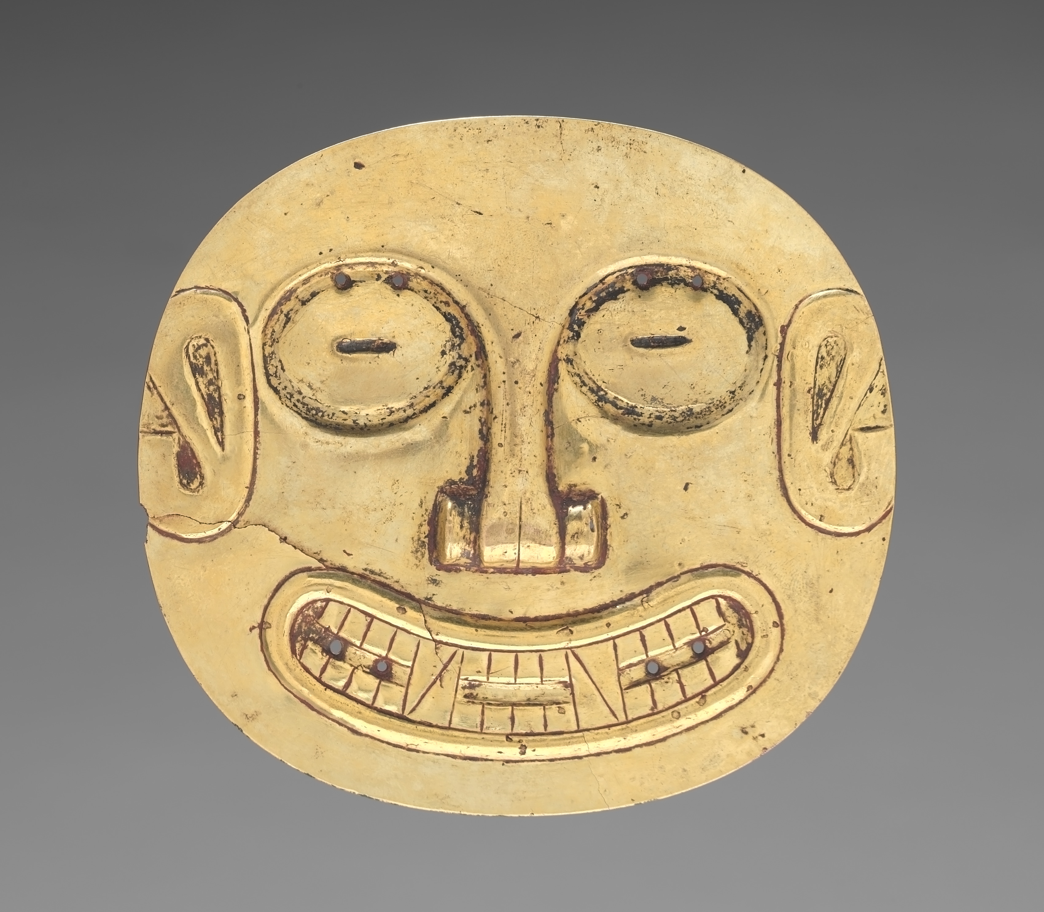 The Ornament from Sitio Conte: Small Plaque by an unknown artist depicts a gold-colored plaque. The plaque is circular and flat. The plaque features a face with a wide smile and large eyes. The face has a long nose. Two circular indents are on either side of the face, possibly representing ears. The plaque has a wide, curved mouth with many vertical lines on the bottom. The plaque's surface is gold-colored with darker spots and lines. The background behind the plaque is a gradient from dark gray at the top to light gray at the bottom.