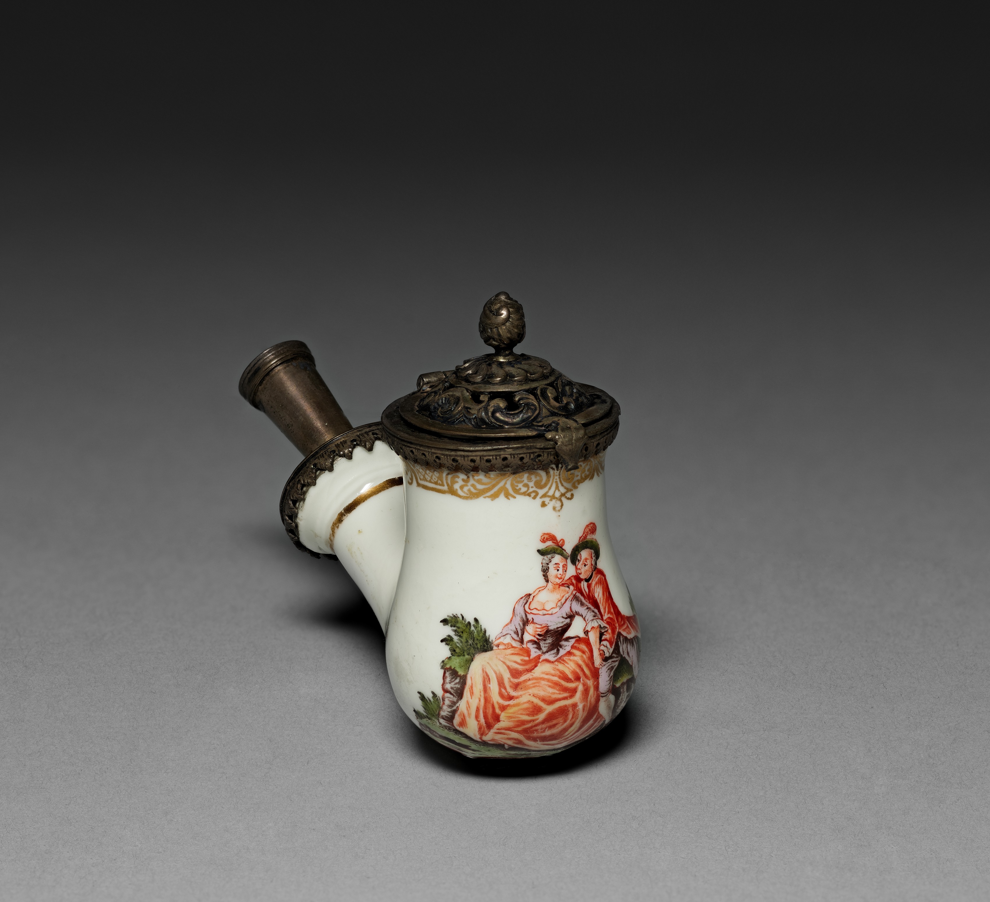 White ceramic pipe head with a metal lid and stem. The ceramic portion features a painting of two people sitting next to each other. The person on the left is wearing a pink dress and the person on the right is wearing a red cloak. There are gold accents on the top edge of the ceramic. The metal lid and stem have a bronze color with ornate details. The background of the image is a gray gradient.