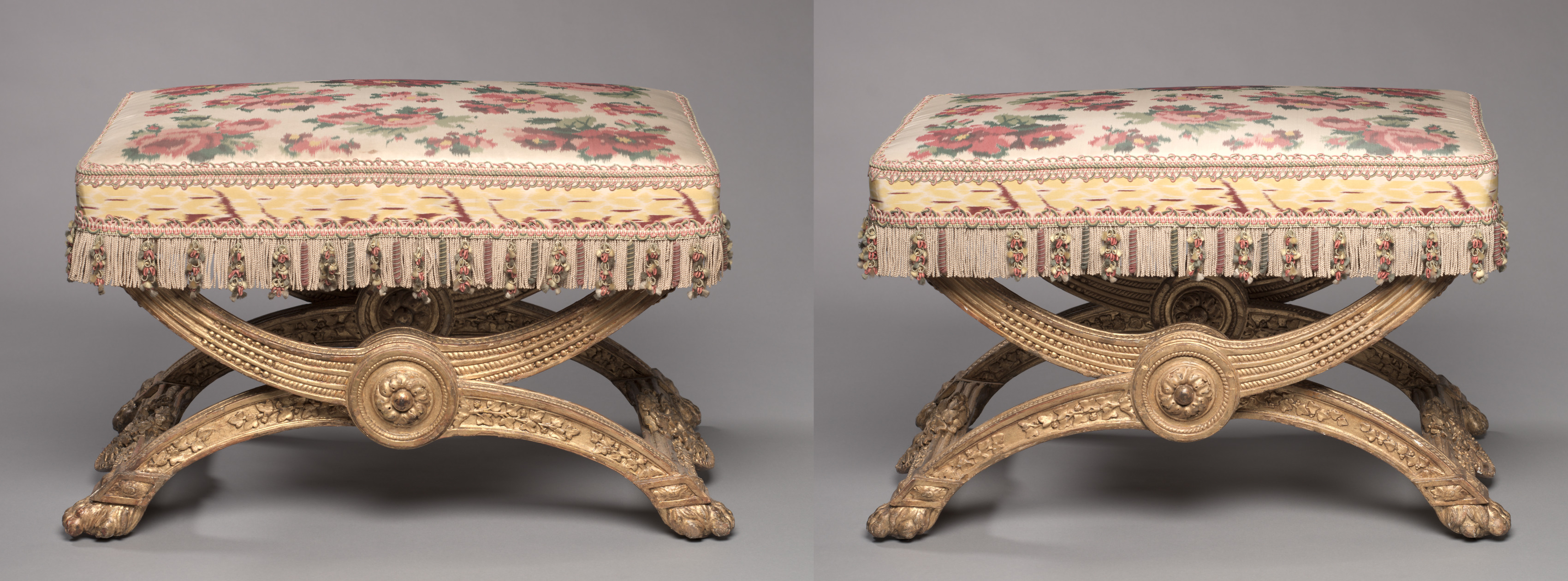 Pair of stools by Jean-Baptiste-Claude Sené. Two identical stools side by side. The stools have a square seat. The seats are upholstered with fabric featuring a floral pattern in red, green and yellow on a cream background. The fabric has a decorative border around the edges with tassels. The base of each stool is made of carved gold-colored metal. The base has four curved legs ending in claw feet. The legs are connected by curved pieces of metal with a circular motif in the center. The background of the image is gray.