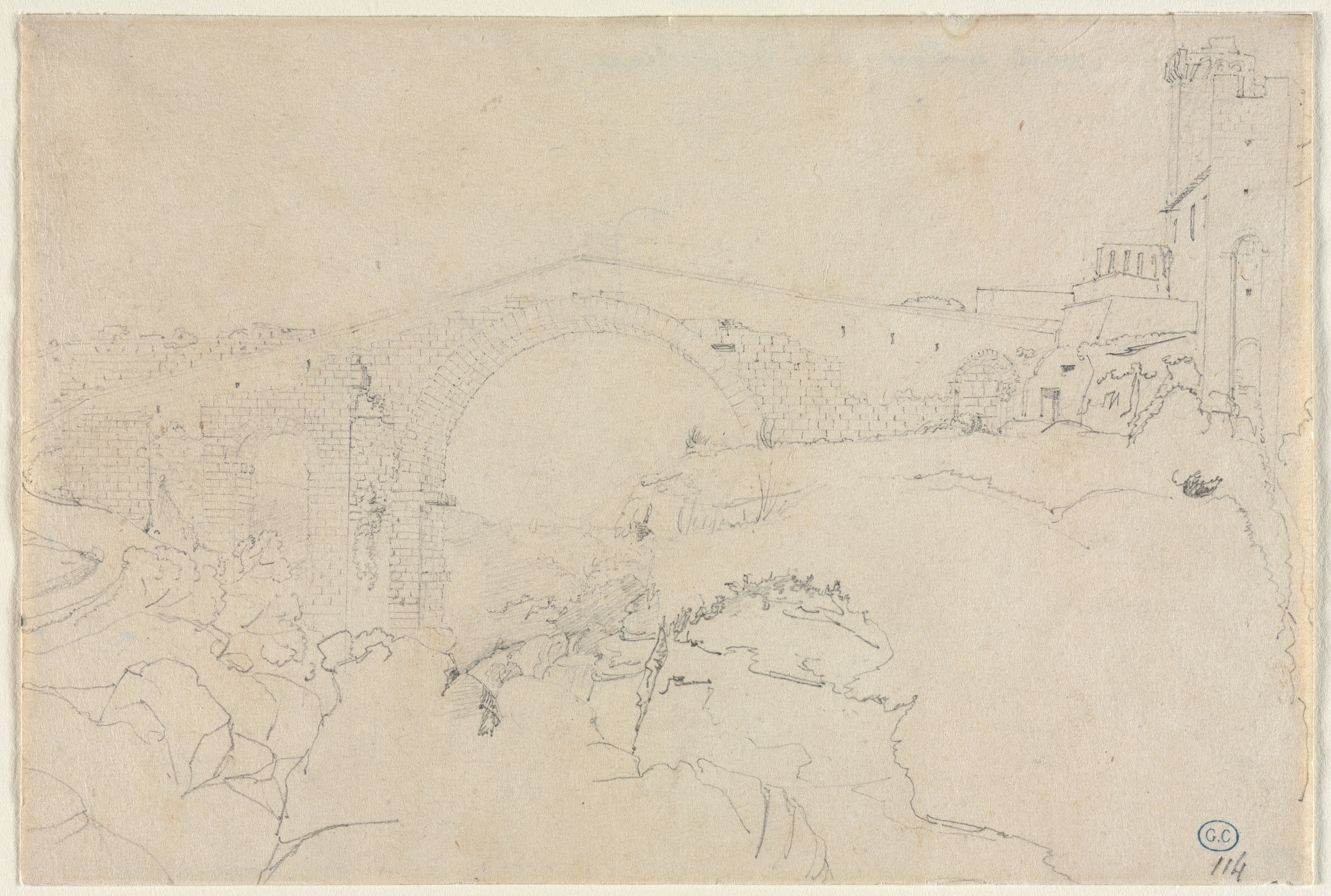 Pencil sketch on tan paper of a stone bridge with an arch spanning a body of water, with a tower and buildings on the right side. The bridge is constructed of stone bricks and has a rounded archway. The water below is depicted with lines suggesting movement. On the right side, a tall tower with a flat top and a building with a sloping roof are shown. The paper has a rough, aged texture and appears to be stained. A small blue oval with the letters "G.C." and some numbers are in the bottom right corner.